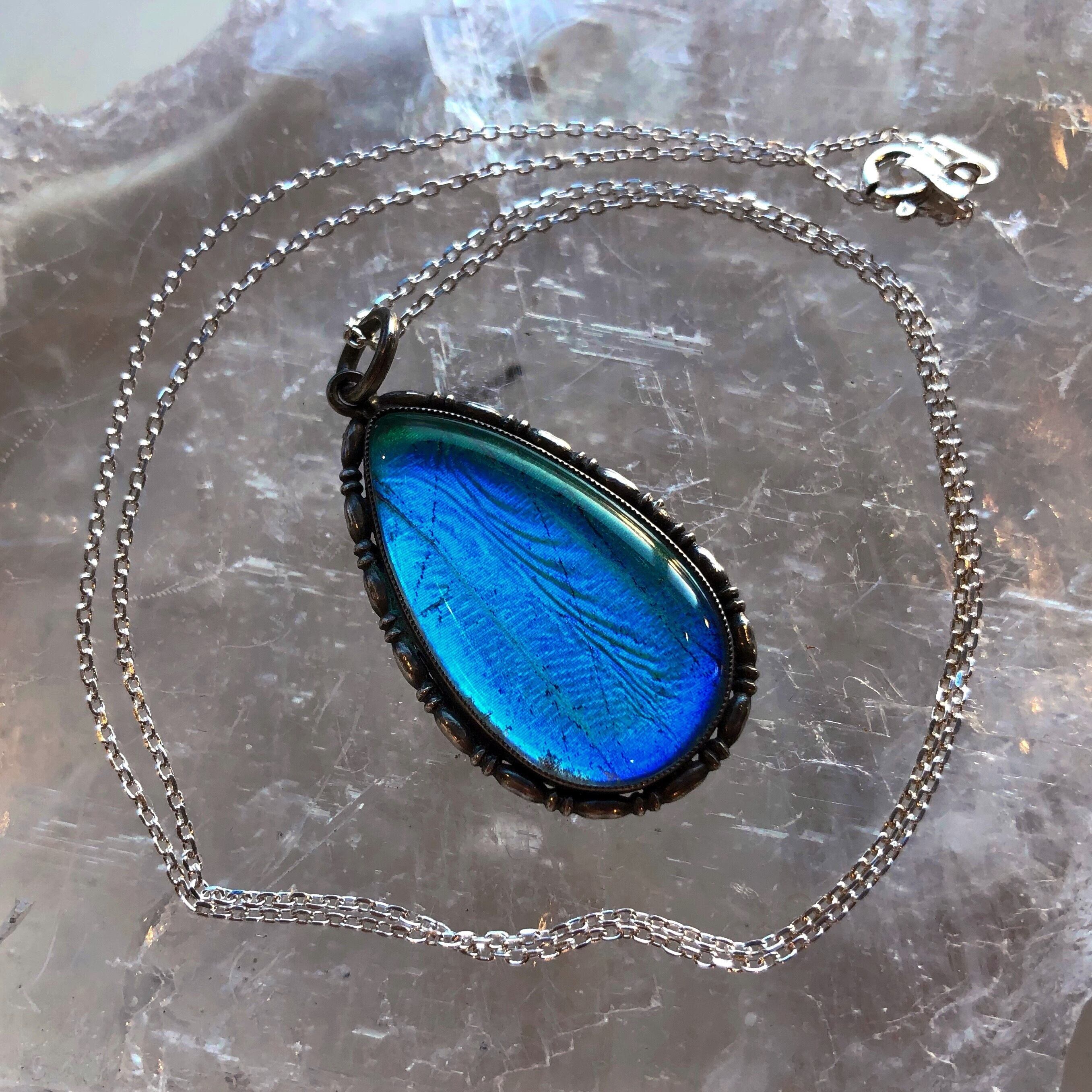 本物のモルフォ蝶の羽根を使ったペンダントです。イギリスでアールデコ時代に流行しました。台はスターリングシルバー製。光を受けてキラキラ光る蝶の羽根は、遠くから見てもとても目立ちます。こちらのお品は特に青の部分が多く、とても綺麗な発色です。