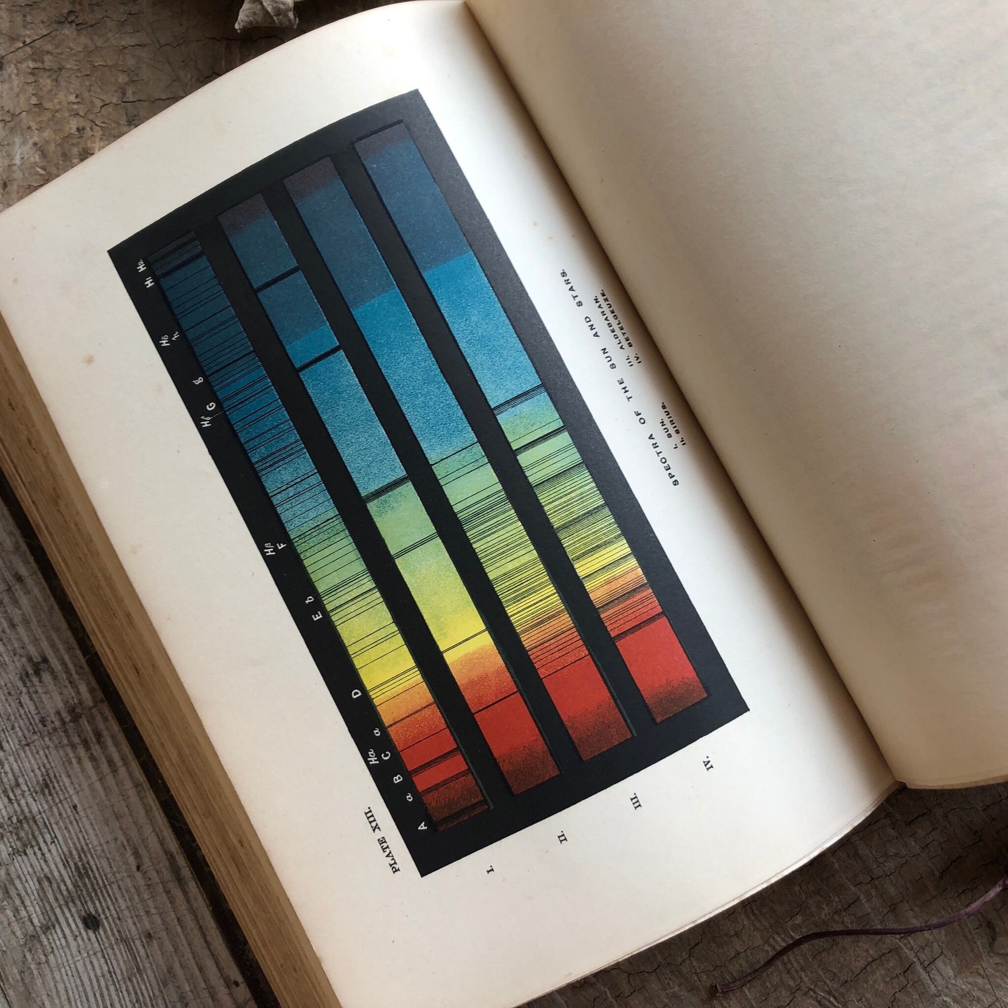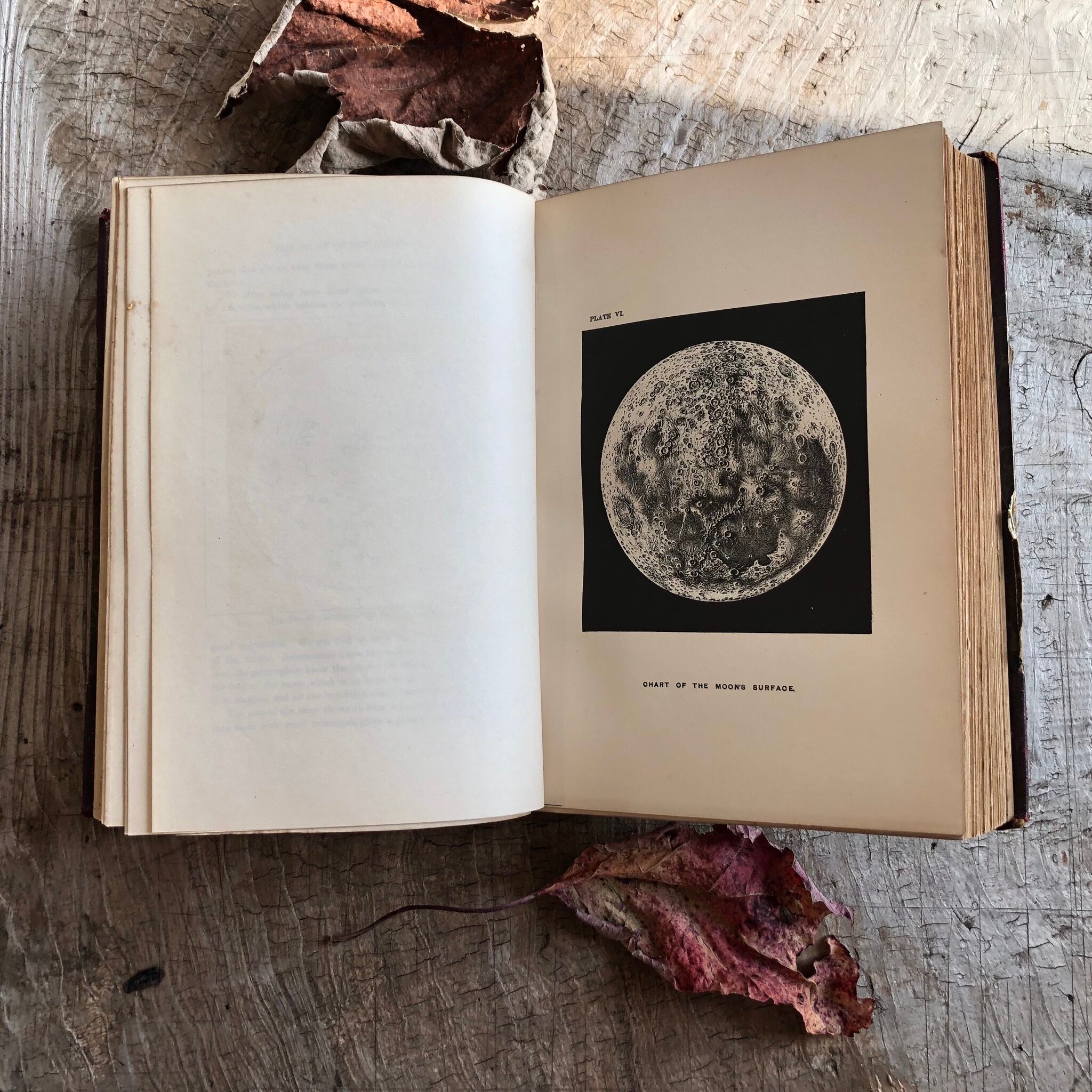 1888年ロンドンの天文学の古文書「天空の物語」はいかがでしょう。子供向けではない一般書で、ずっしり重く大きく、カラーとモノクロのリトグラフがたくさん入っています。背表紙には土星が箔押しで記され、本棚にあるだけでも良い雰囲気。