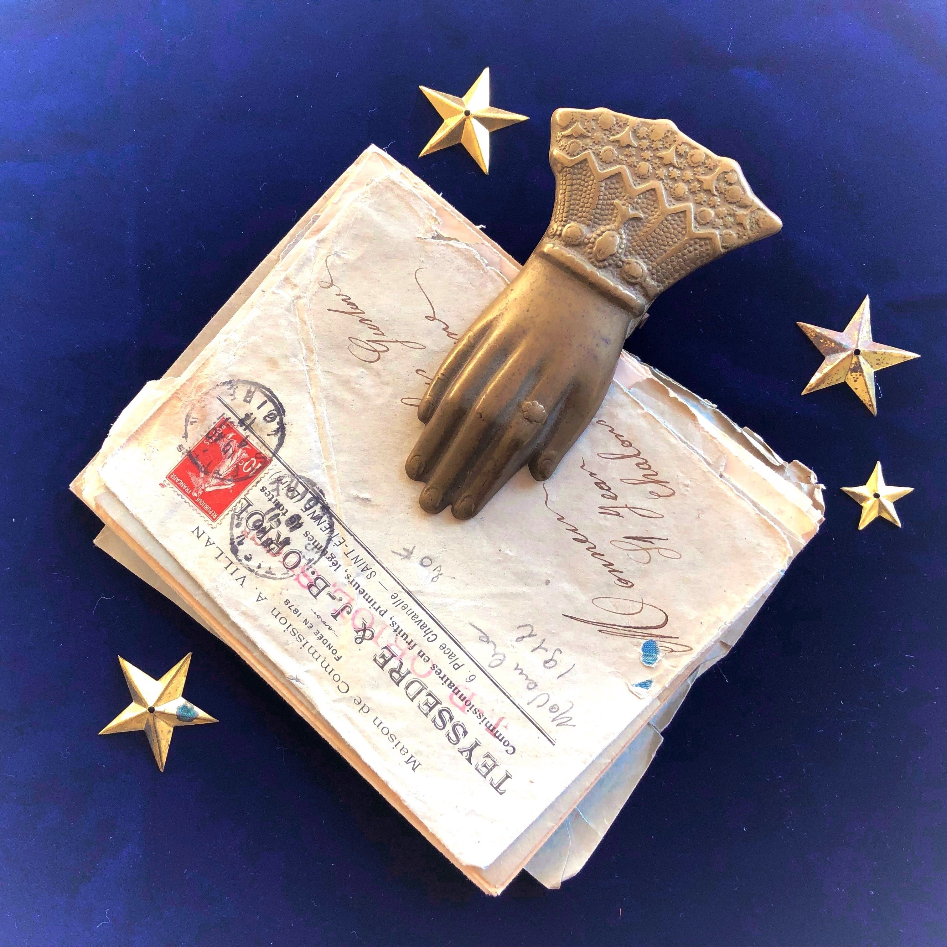 ヴィクトリア朝イギリスの真鍮のクリップはいかがでしょうか。たおやかな女性の手が優しく紙を押さえてくれます。レースの袖に人差し指の指輪、柔和な造形が美しいです。現在でも十分実用可能なので、優雅な机上アイテムとしていかがでしょうか。