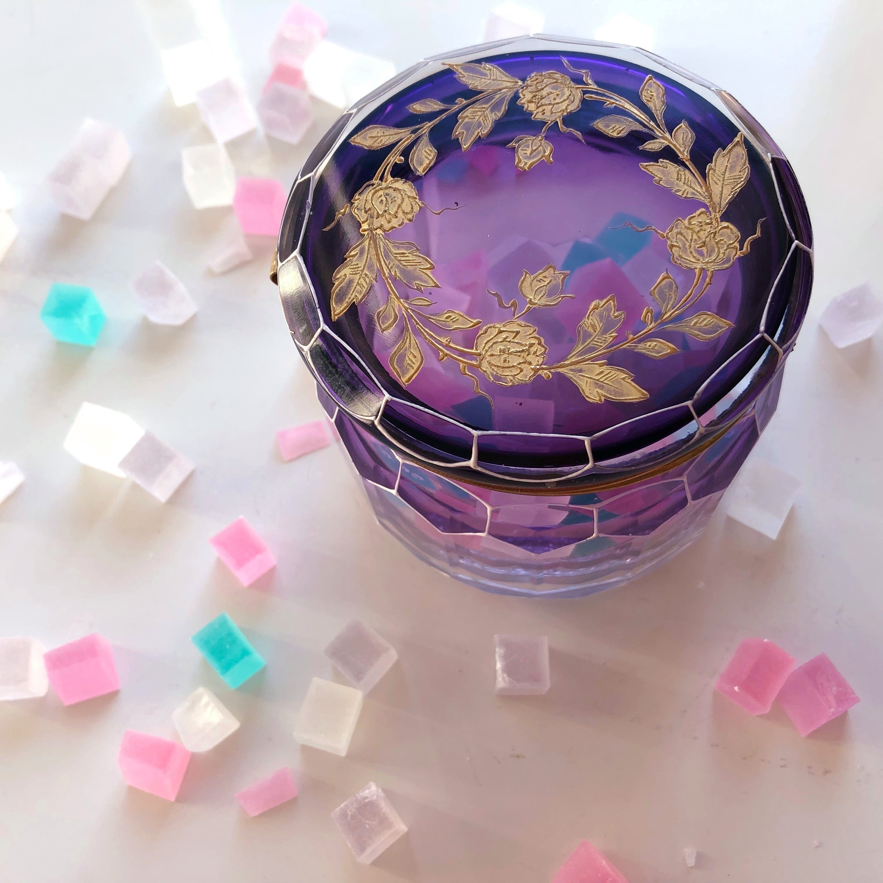ヴァイオレットのボンボニエールはいかがでしょうか。透明から深いすみれ色へのグラデーションのクリスタルガラスに、丁寧な金彩で薔薇が描かれ、匂い立つような美しさ。またこのカットが素晴らしく、光に翳すとキラキラ光って宝石のようです。