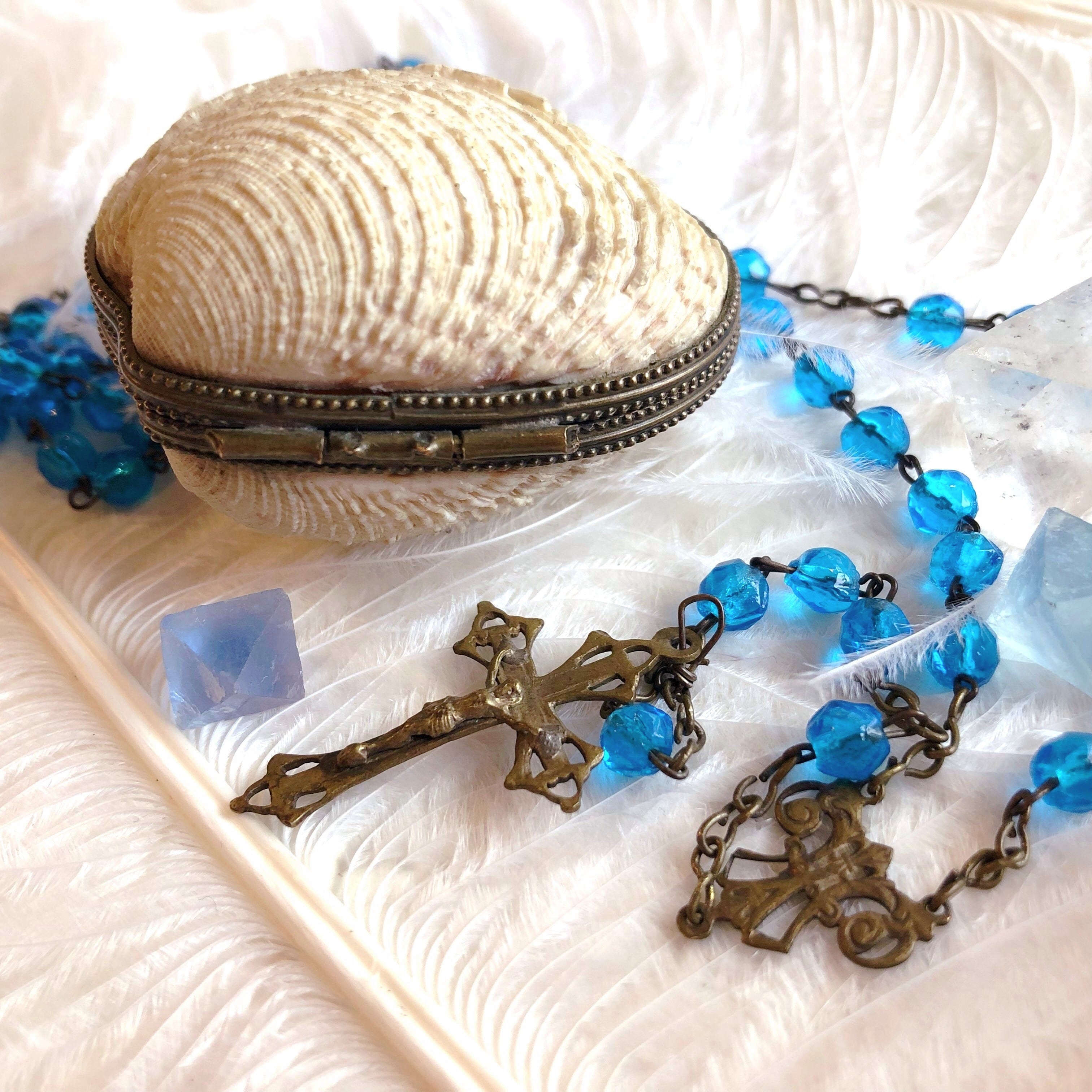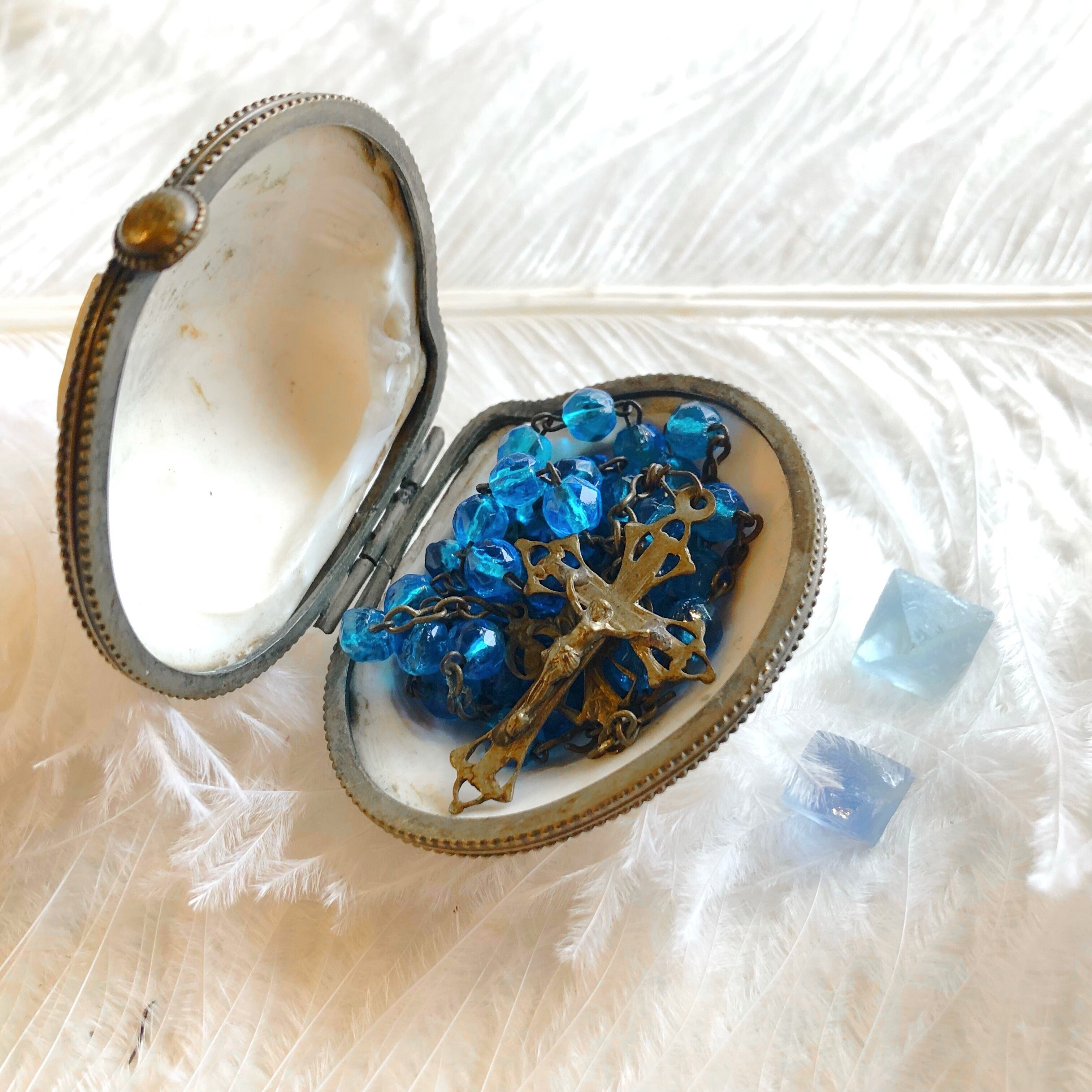 ころんと丸い二枚貝を開けると、中からは鮮やかなマリンブルーのロザリオが出て来ます。まるで貝の記憶の中の海のように晴れやか。優雅な十字架はアール・ヌーヴォー様式で真鍮製のようです。