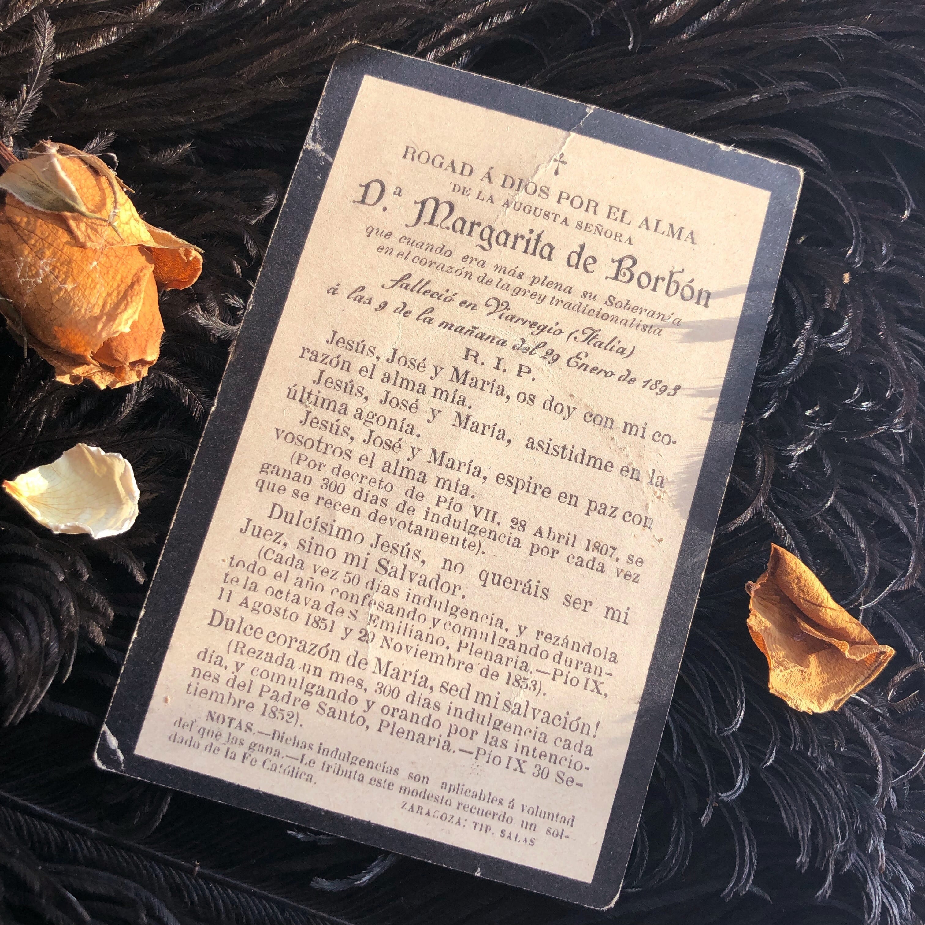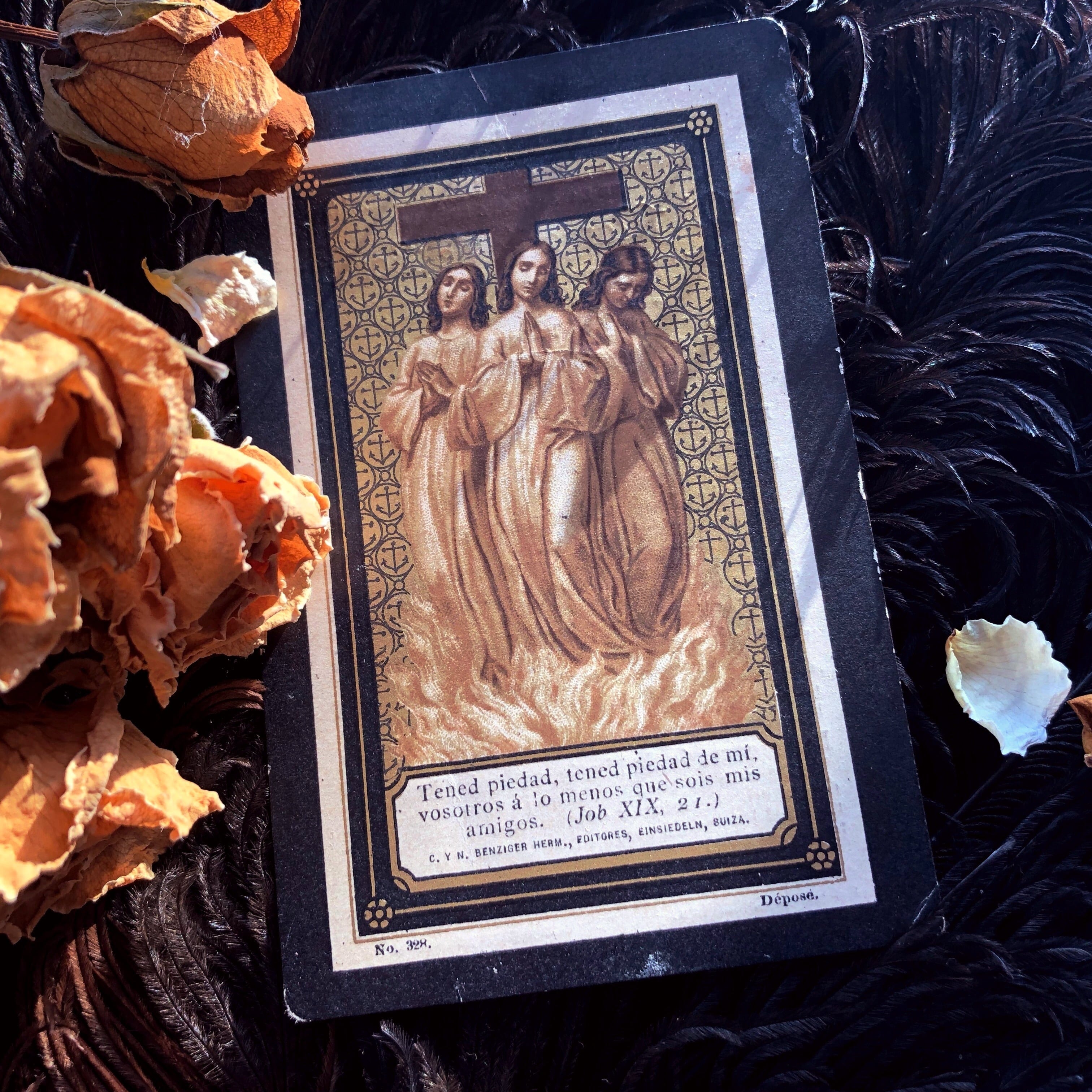 1893年1月29日に亡くなったマルガリータという方のカードです。表の炎の中の女性たちの絵の下には、「我が友よ、私を憐れんでください。」という聖書ヨブ記の一部が書かれています。
