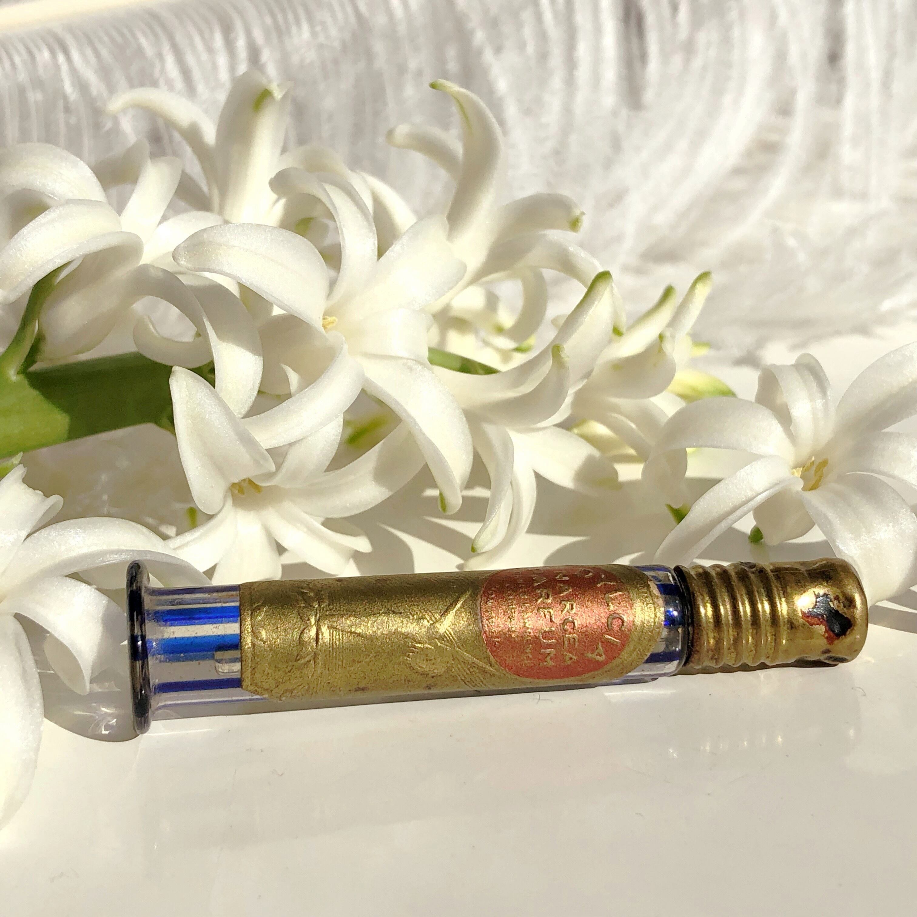 青いストライプの香水瓶はいかがでしょうか。手吹きの華奢なガラス瓶に真鍮の蓋。とても軽やかで可憐な印象です。オリジナルのラベルも良い状態で残っています。19世紀カナダ製。サイズは、高さが約6.5センチ、直径約1センチ(底部を除く)です。