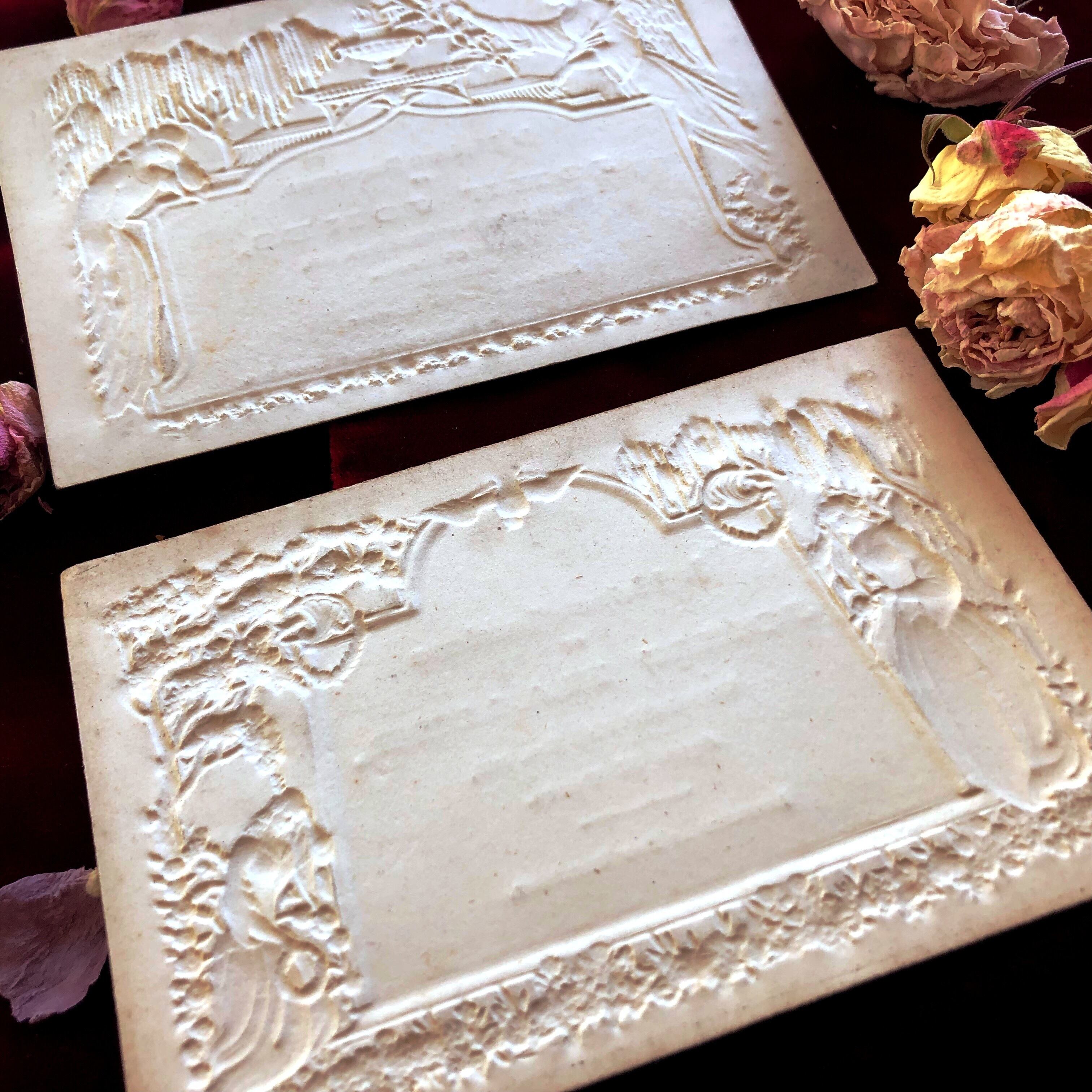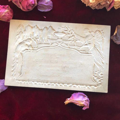19世紀英国製のデスカードはいかがでしょう。お葬式などで配られる追悼用のカードですが、このタイプは深いエンボスが特徴で、紙製なのにまるで石膏レリーフのような印象です。精巧な浮き彫りで、嘆く女性、天使、柳の木などが描かれています。