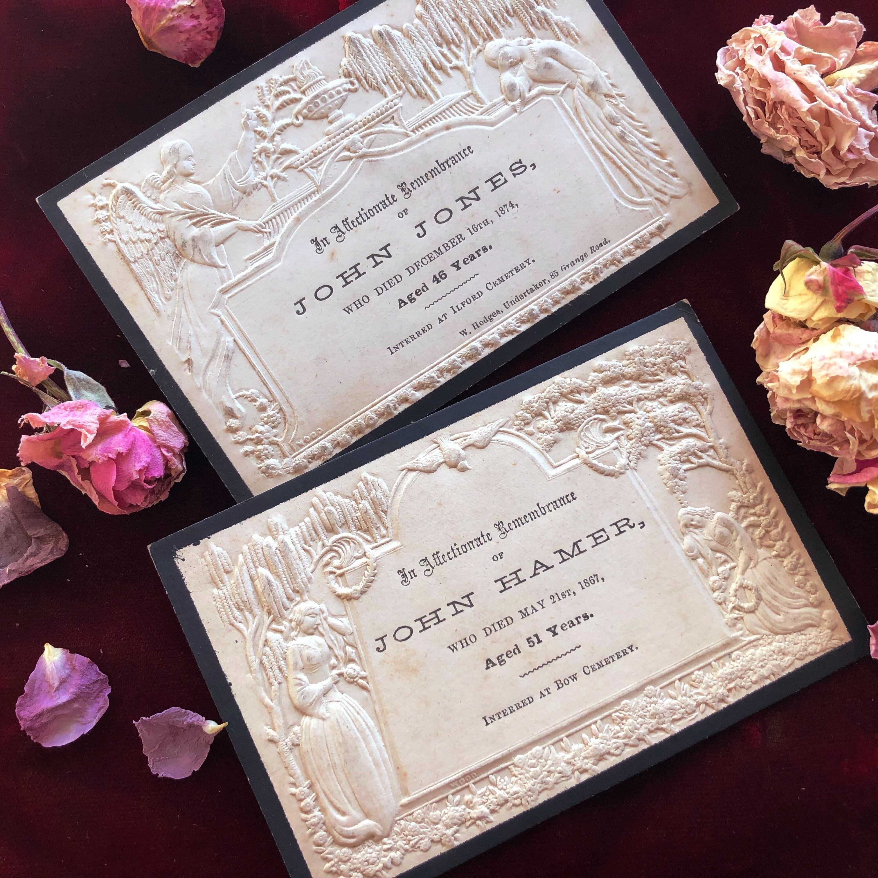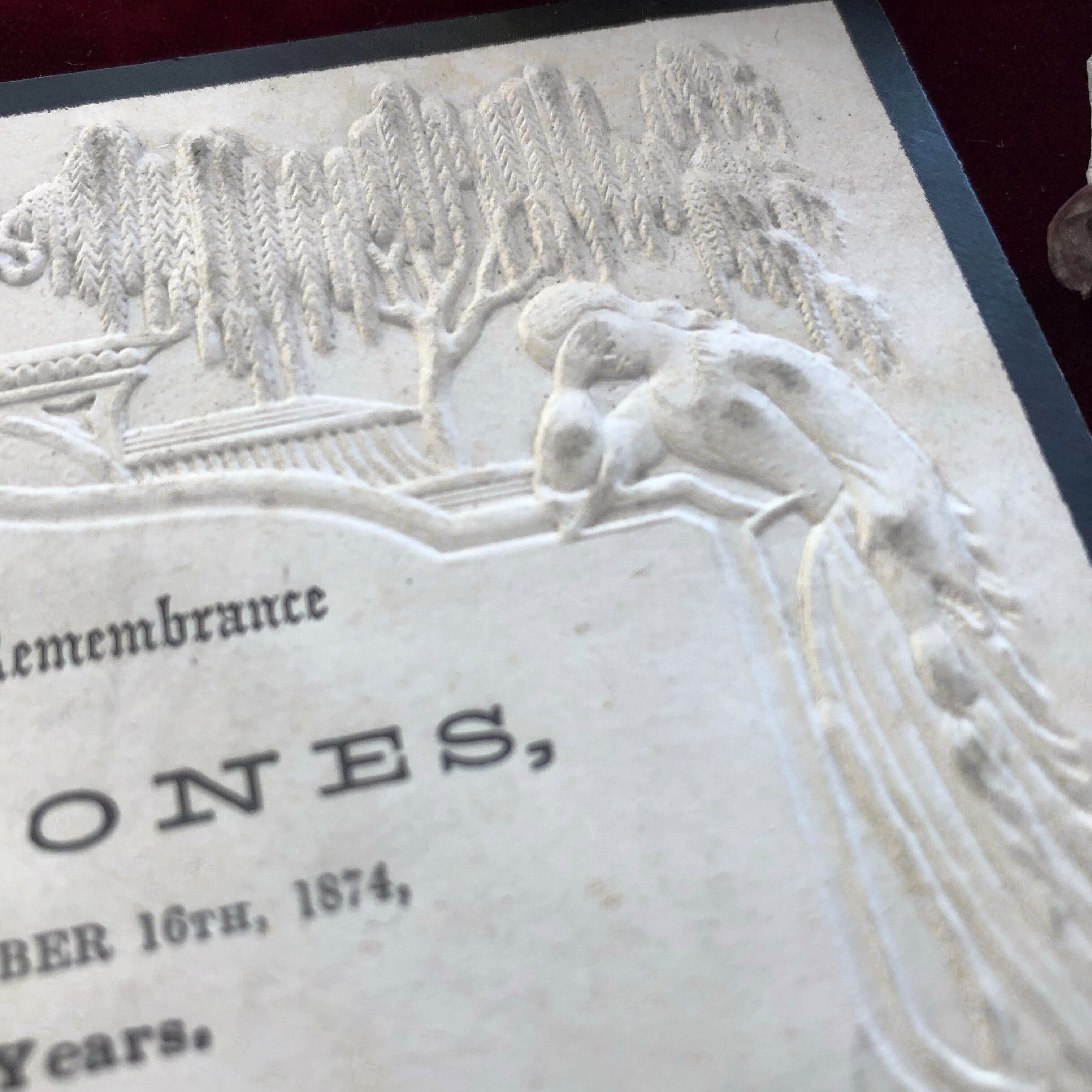 1874年12月16日、46歳で亡くなった John Jones という方のカードです。このエンボスの深さは裏から見た方がよく分かるかもしれません。細かい柳の葉の一枚、花びら一枚まで精巧に押されていて、19世紀の印刷技術の高さがよく分かります。