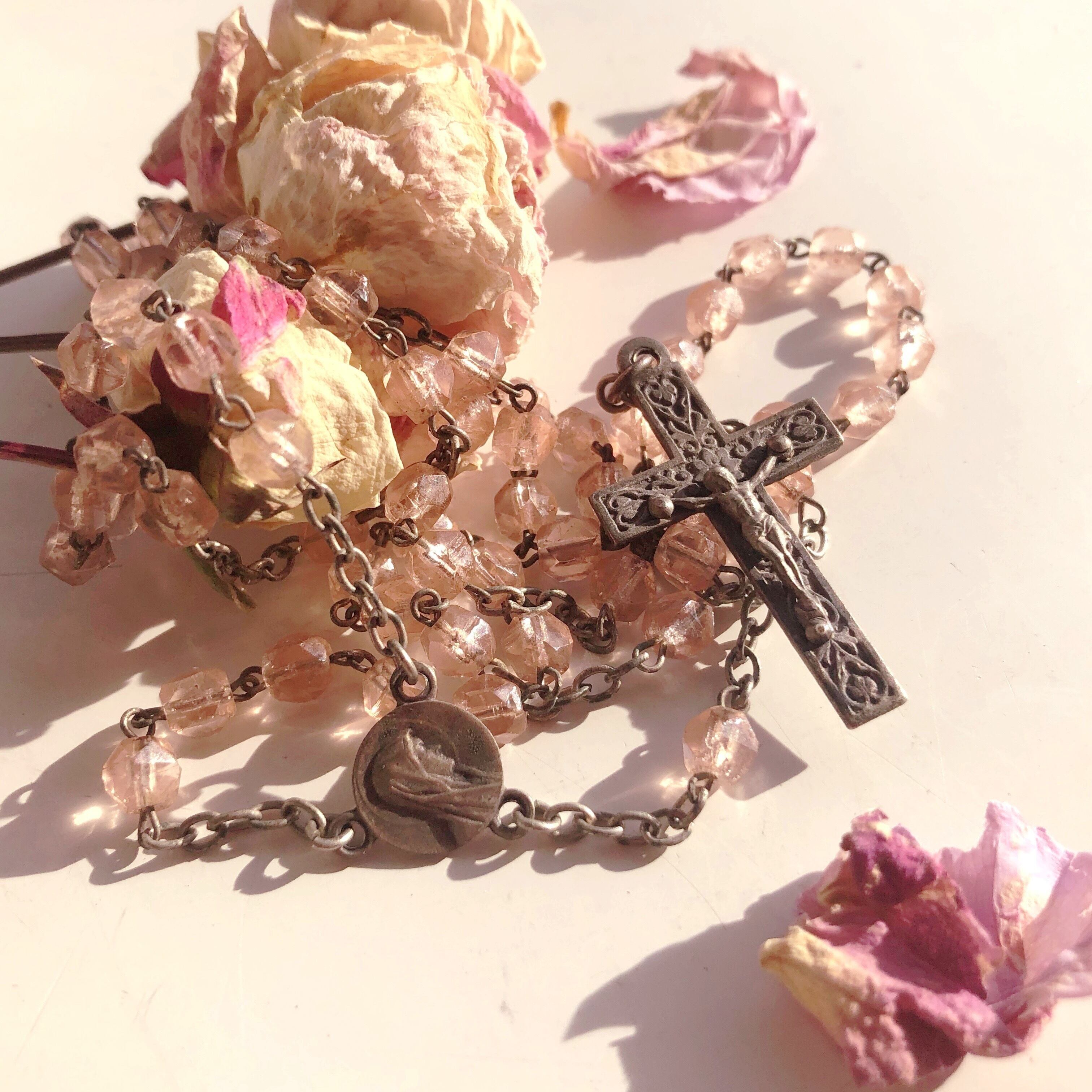 フランス製、アンティークの淡いピンクのロザリオです。クロスのイエス様の周りには細かい模様が、クロスとチェーンをつなぐ丸い小さな金属板には女性の横顔が刻まれています。この金属板の裏にはユリと星がありますので、この女性はマリア様でしょう。