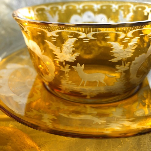 ボヘミアンガラスのフィンガーボウルはいかがでしょう。黄昏時のような黄金色のガラスに、ボヘミアの深い森に遊ぶ狐や鹿などが描かれています。本来は海老や蟹などの手を使って食べる料理の際に指を洗う為に出されるものですが、フルーツやデザートを盛り付けても素敵ですね。