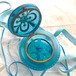 青いフロストガラスのボンボニエールはいかがでしょうか。ボヘミアンガラスの最高峰、モーゼル社のもので、春の海のような優しい磨りガラスに金色の星が手彩色で描かれていて、とてもファンタスティック。