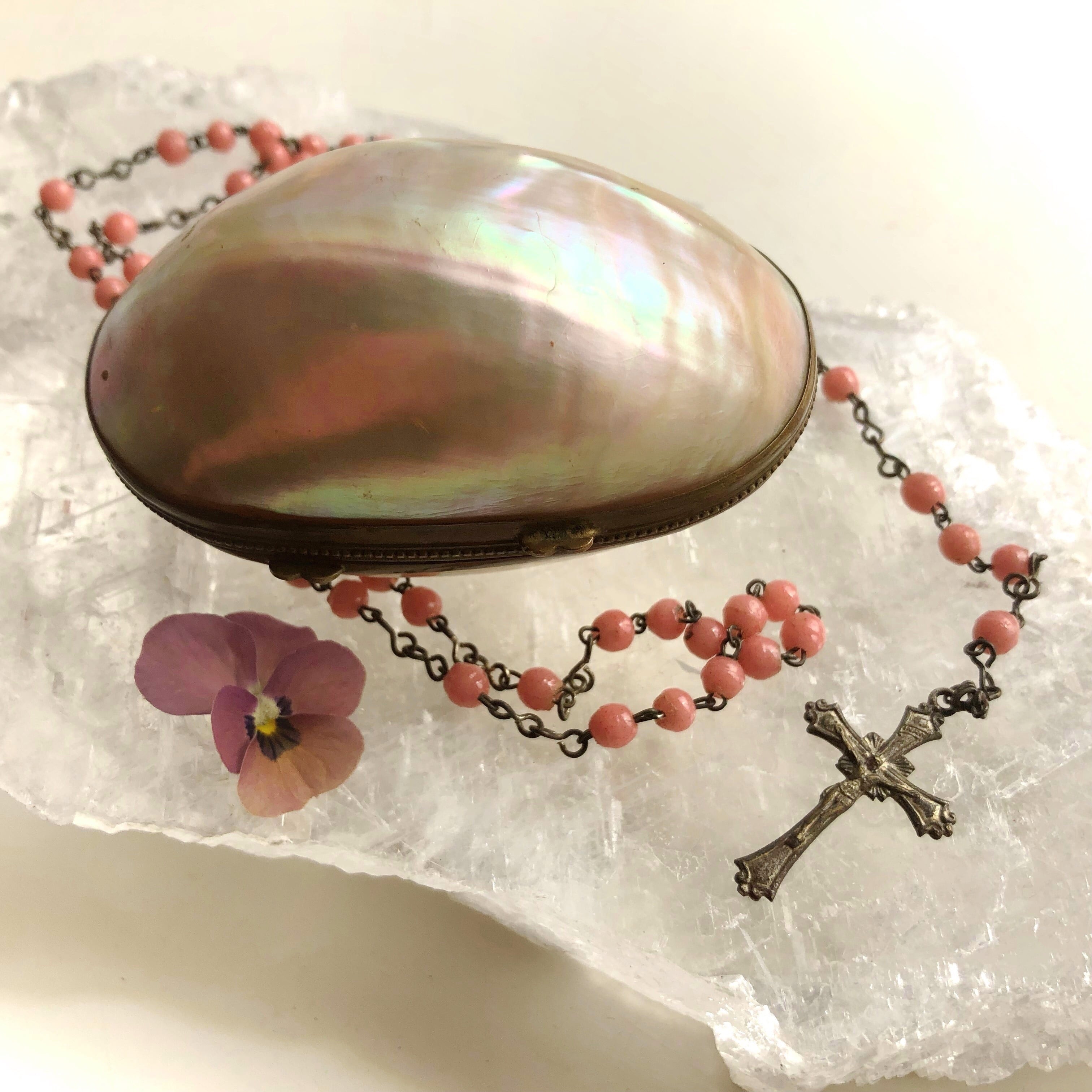真珠貝で作ったケースと、同じく真珠貝と金属で作ったロザリオです。製作年などは不明ですが、真珠貝特有の柔らかい虹色の光沢があります。ケースの縁の金属部分は時を経た良い風合いです。