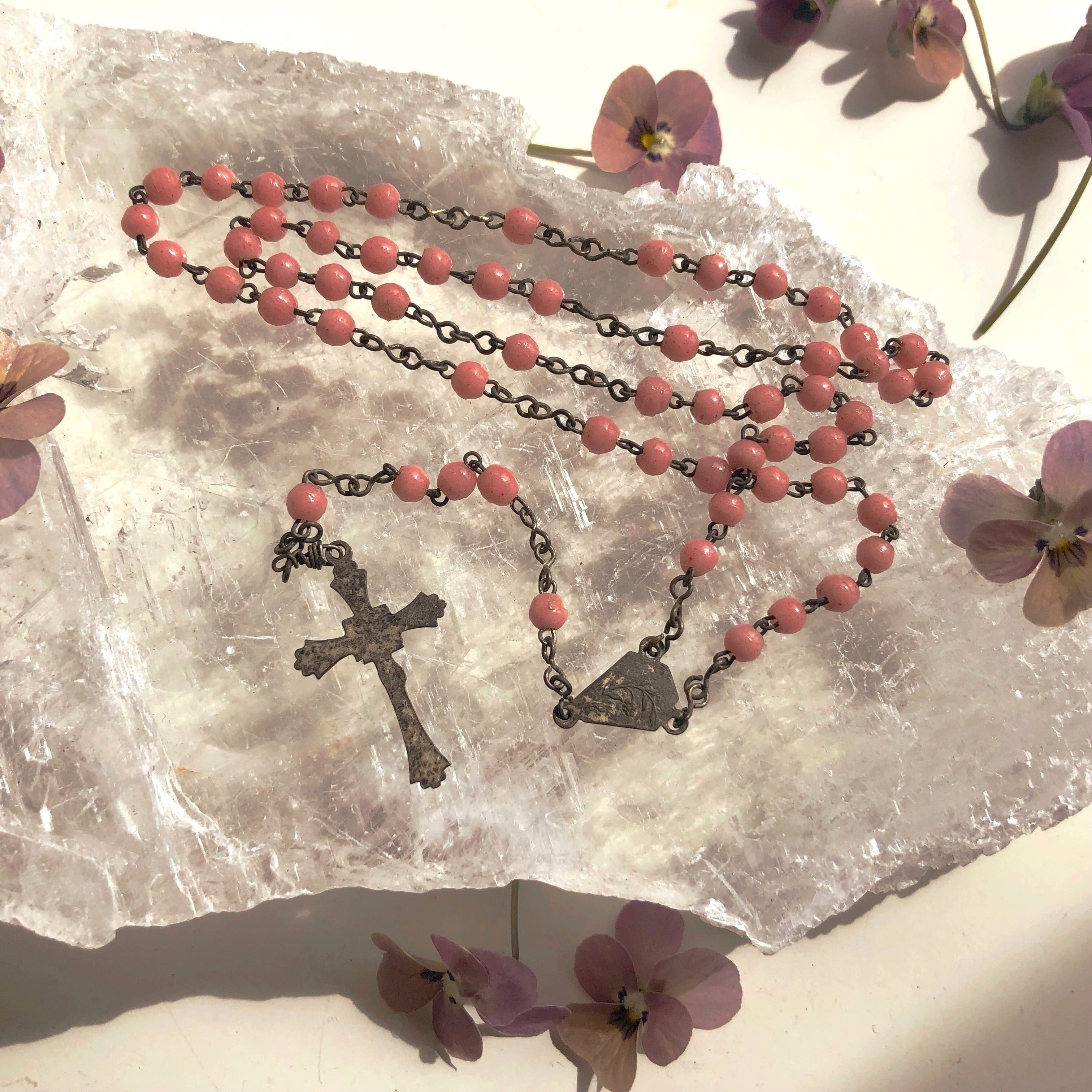 クロスは、チェーンに愛らしい桜色のガラスビーズをあしらい、チェーンとクロスを繋ぐ金属板にはマリア様の横顔と裏には百合の花があります。