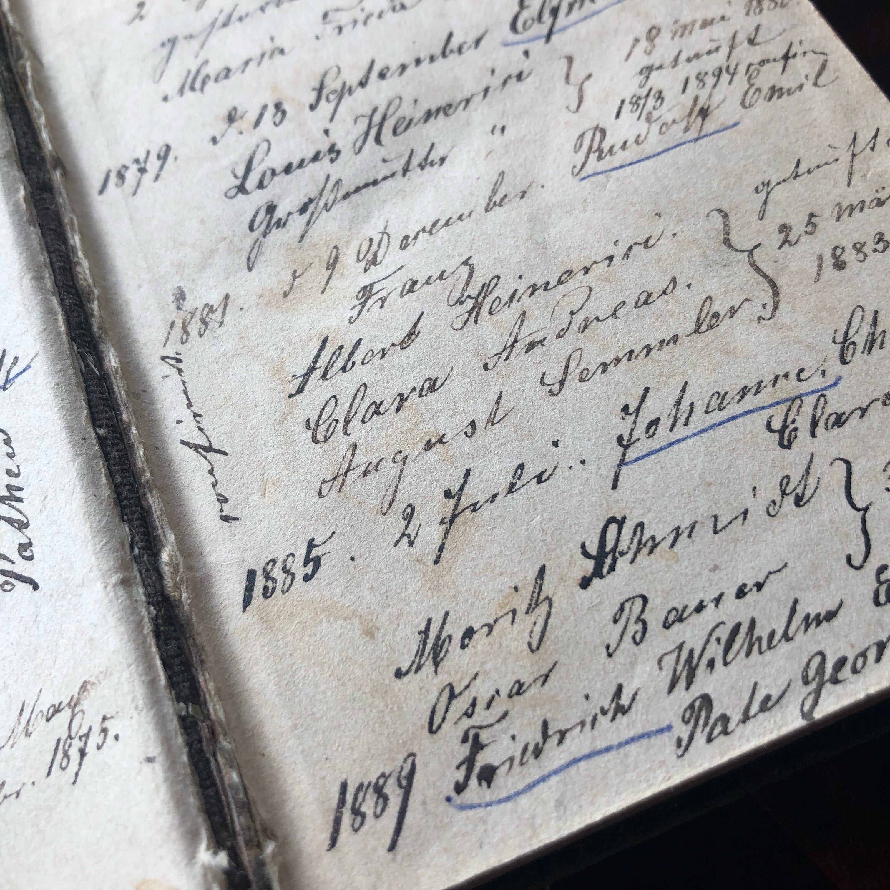 ドイツの福音書はです。深い栗色のベルベット、金の箔押し、金付けと豪華な作りです。見返し部分に、人の名前と年が記されています。これは亡くなった人の記録でしょうか。またページの間に四つ葉のクローバーが挟まれていました。誰がどんな気持ちで挟んだのでしょうね。