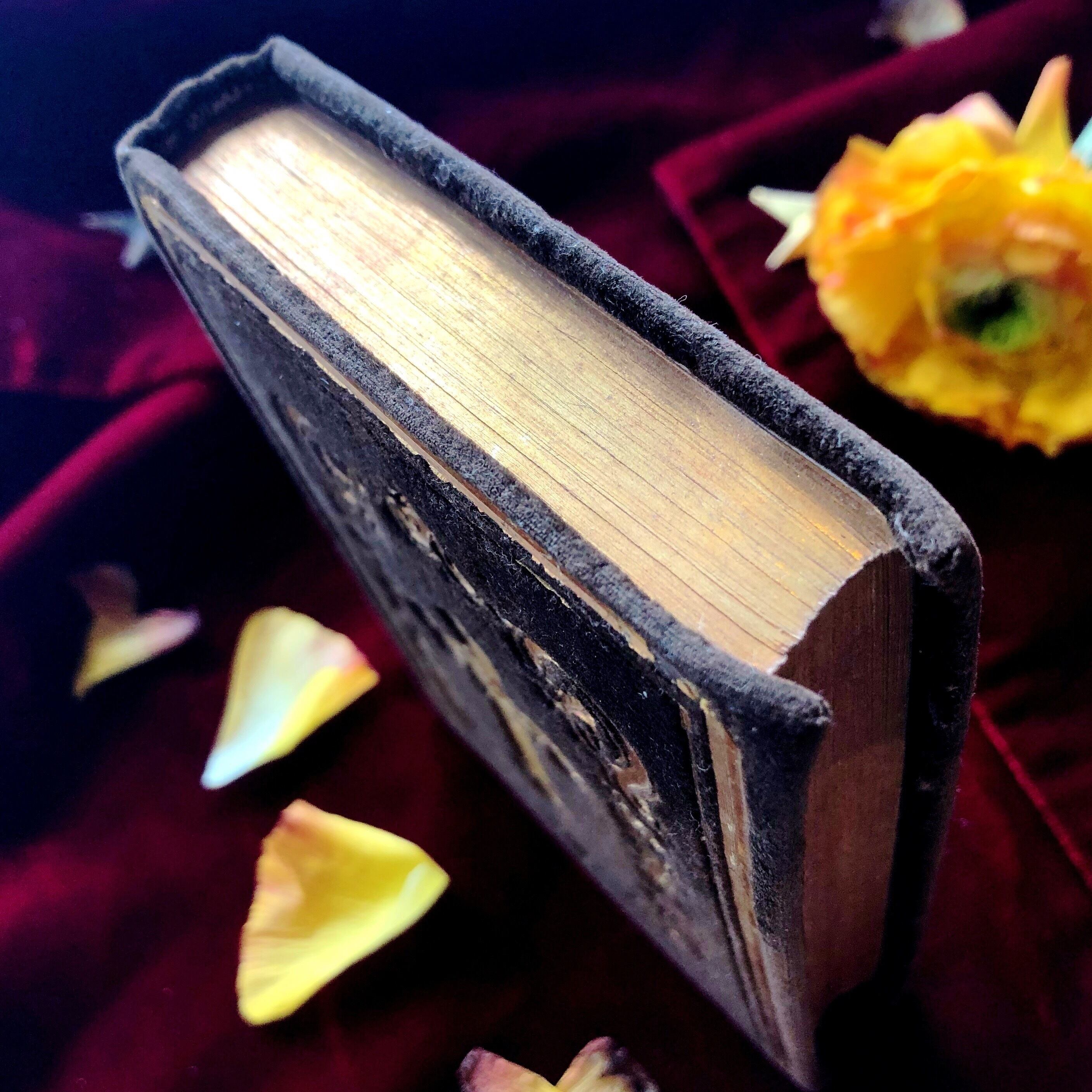 古いものですので、ベルベット、金の装飾に傷みや欠けが、中身も含めて全体に汚れがあります。四葉のクローバーは240~241ページに挟まれています。
