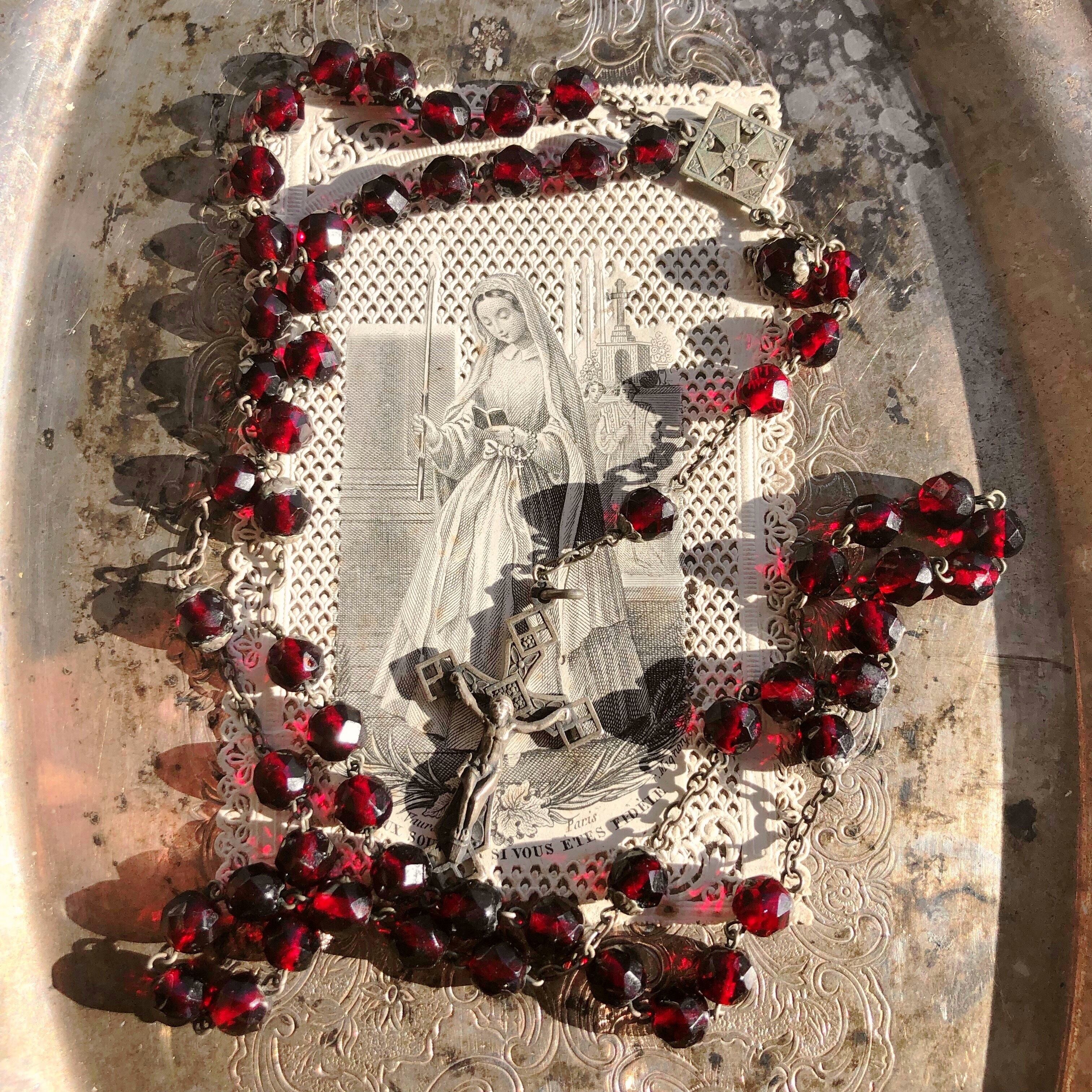 美しい深紅のチェーンのロザリオです。室内では深い黒みを帯びた赤、それが光を浴びると一瞬血のように煌めきます。クロス、金属板のデザインも繊細で、素敵です。