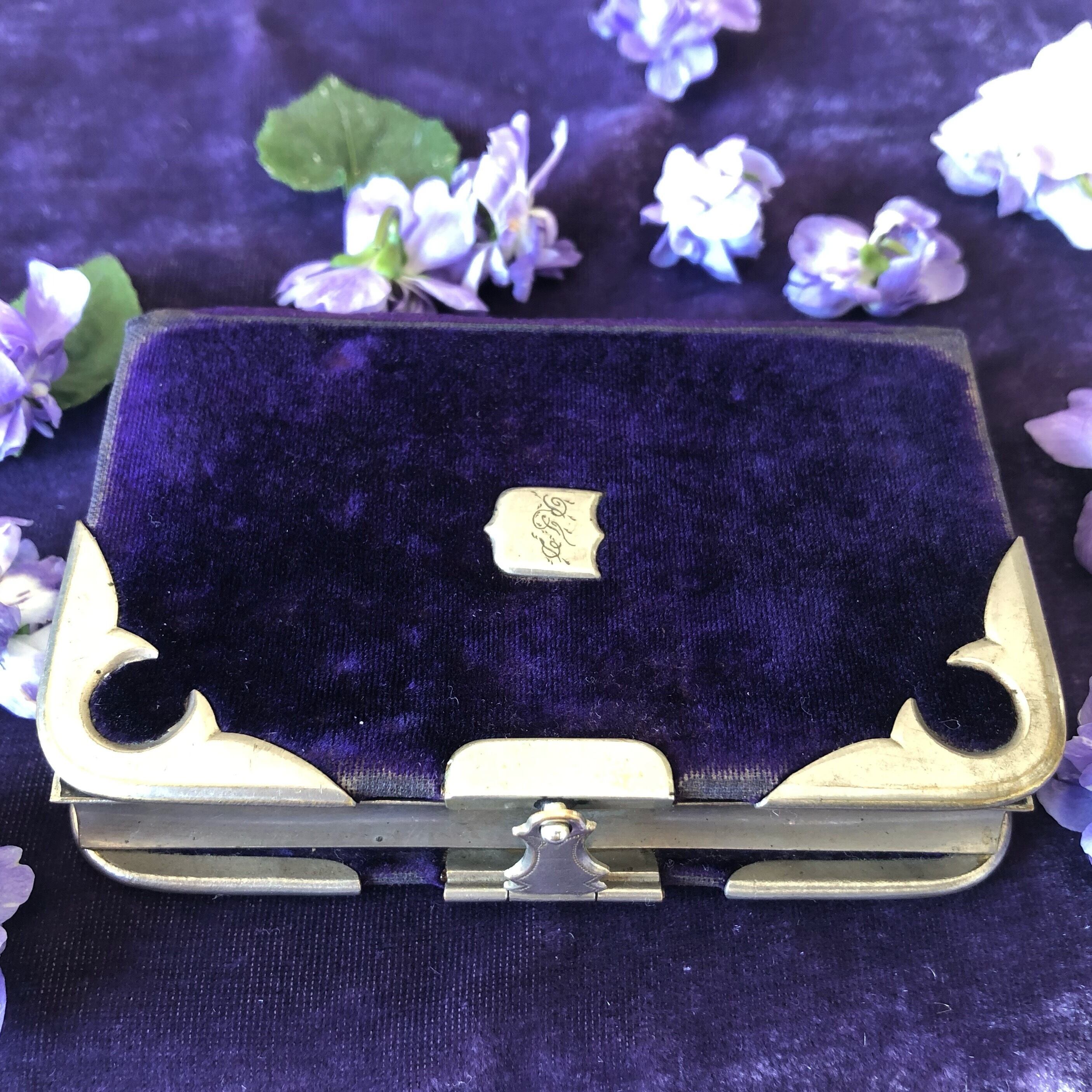 深いすみれ色のベルベットのパスケースはいかがでしょう。銀色の留金を外すと中は蛇腹になっていて、こちらも鮮やかなバイオレット。隠しポケットもあります。イニシャルはRTDでしょうか。 時代の割には傷みが少なく状態は良好です。