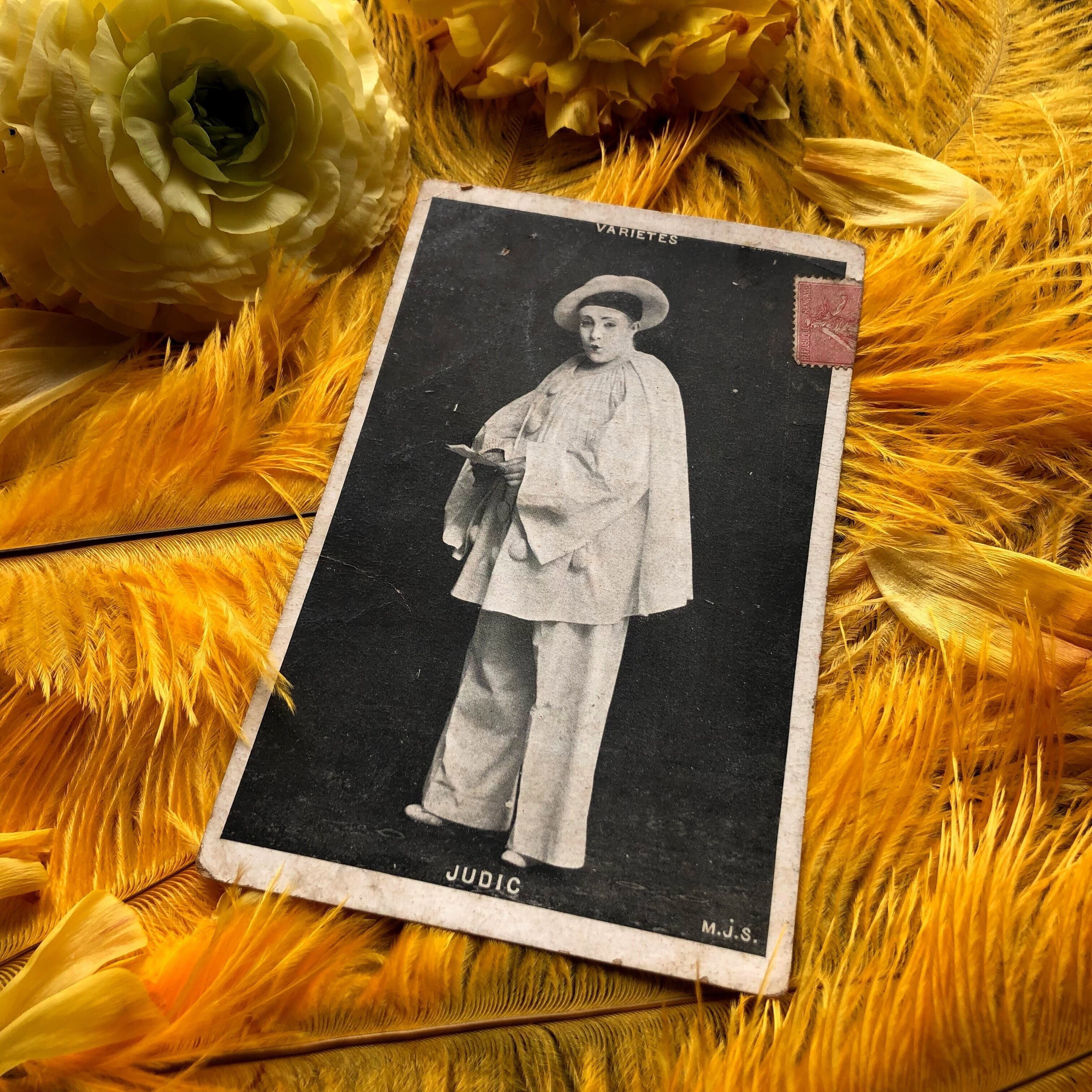 フランス製のポストカードはいかがでしょう。こちらはアンナ・ジュディック。19世紀にフランスで活躍した舞台女優さんのポストカードです。彼女の舞台「三角関係」に着想を得てエミール・ゾラは「ナナ」書いたとか。消印は1905年、ボルドーのジロンド県から投函されています。ハガキの文面はフランス語で書かれています。