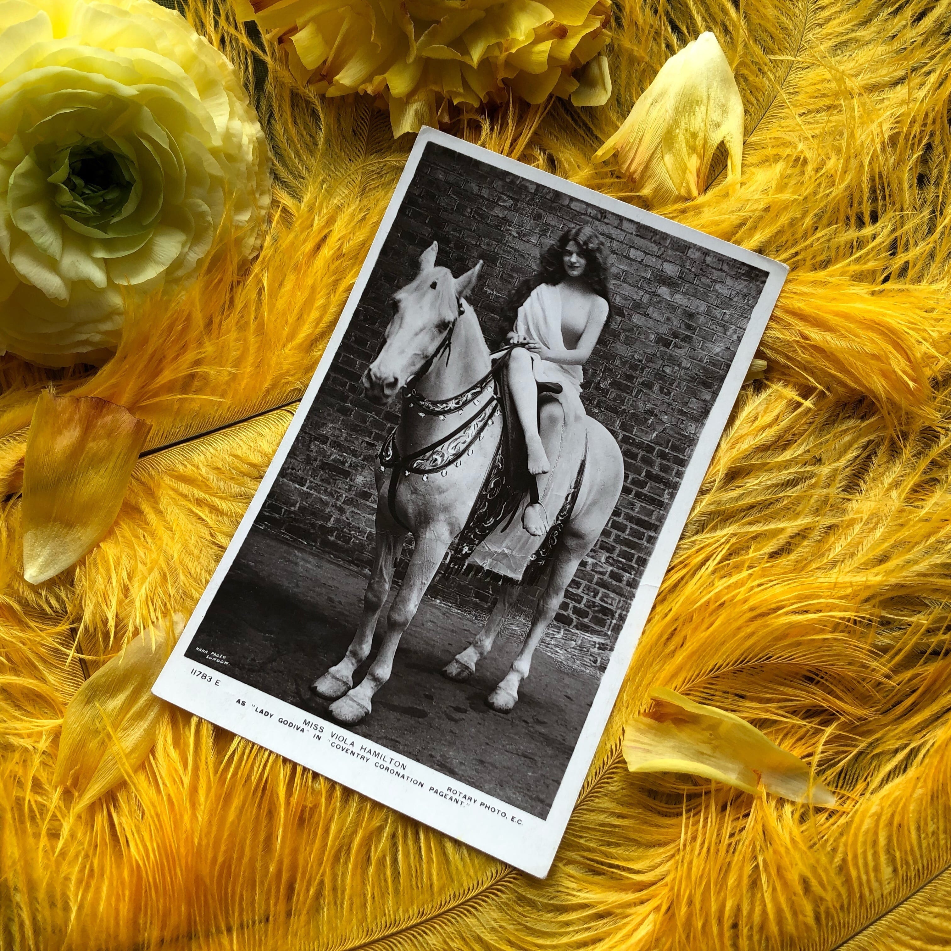 こちらはミス・ヴィオラ・ハミルトンがレディ・ゴディヴァに扮したポストカードです。レディ・ゴディヴァとは、中世イングランド、マーシア王国お后様で、夫の圧政を諌める為にコヴェントリーの街を全裸で馬に乗って行進したという伝説が残っています。この写真はコヴェントリーの野外劇で撮られたものです。凄艶な美女ですね。きっと当時人気があったのでしょう。一見裸に布を纏っているだけに見えますが、よく見ると全身タイツのようなものを着ているようです。ちょっと解読出来ないのですが、フランス語の筆記体で書かれ、イギリスからフランスに出された葉書です。