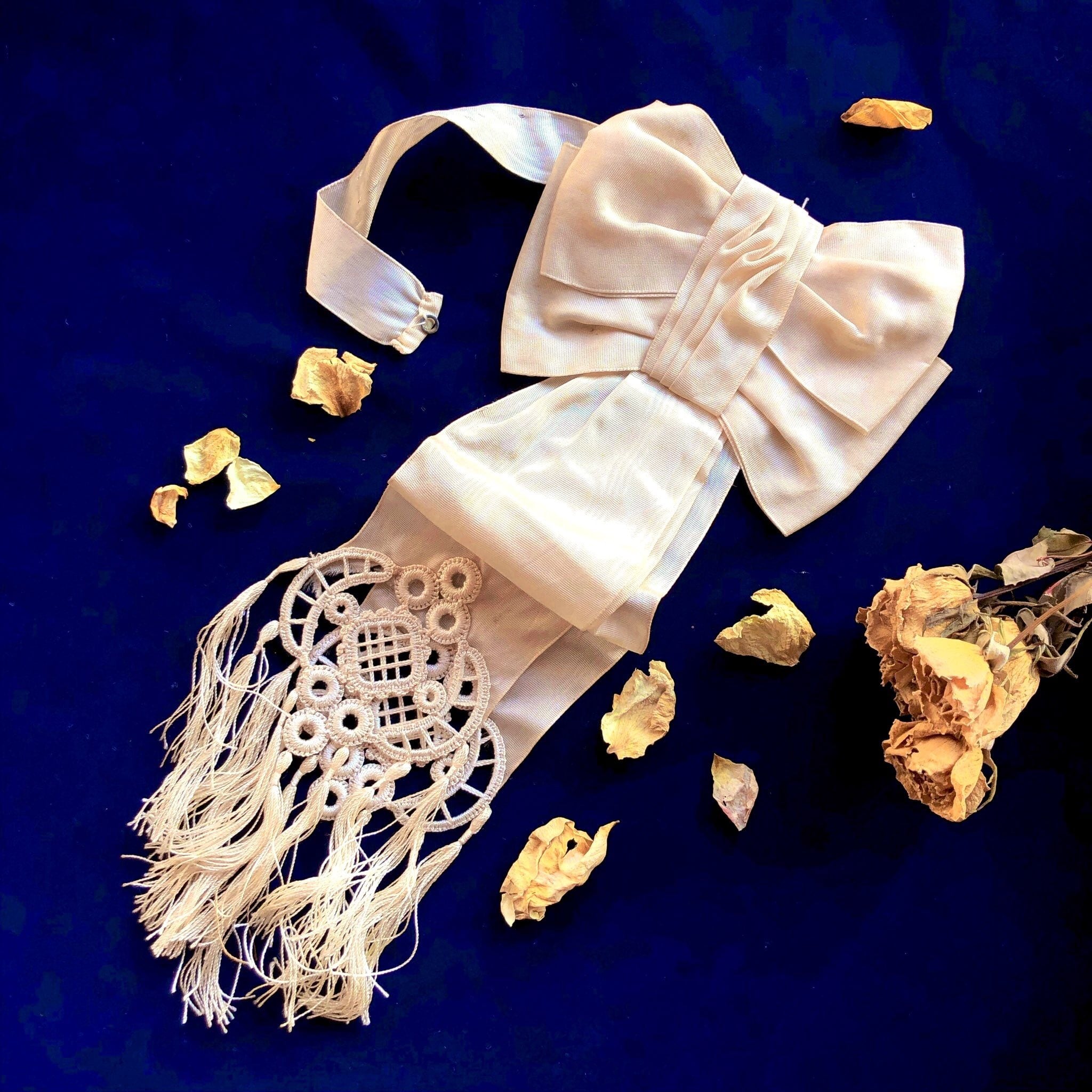 初聖体拝領のアームバンドはいかがでしょう。美しいシルクサテンと凝った縁飾りが素晴らしいですね。初聖体拝領とはカトリックの儀式のひとつで、8歳くらいで受ける通過儀礼のようなものです。その記念品として大切に保存されていたのでしょう。良い状態です。