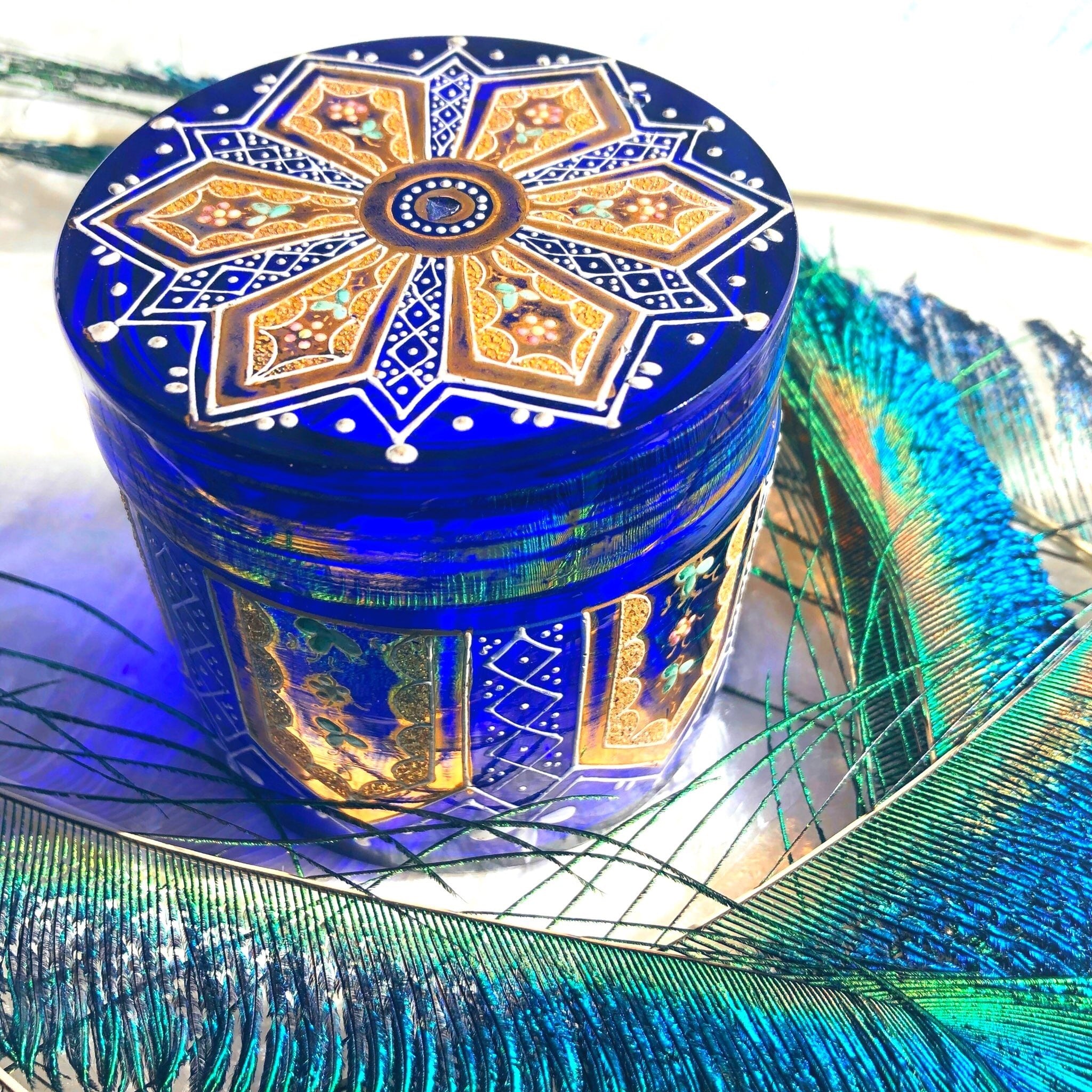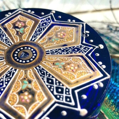 アラベスク模様のボンボニエールはいかがでしょう。目の覚めるようなブルーのガラスに、まるで砂漠の国から来たようなエキゾチックな模様が描かれています。手作業による細かい金彩とエナメルが美しく、鮮やかで繊細なボンボニエールです。砂糖菓子の他、お香など入れても似合いそうですね。