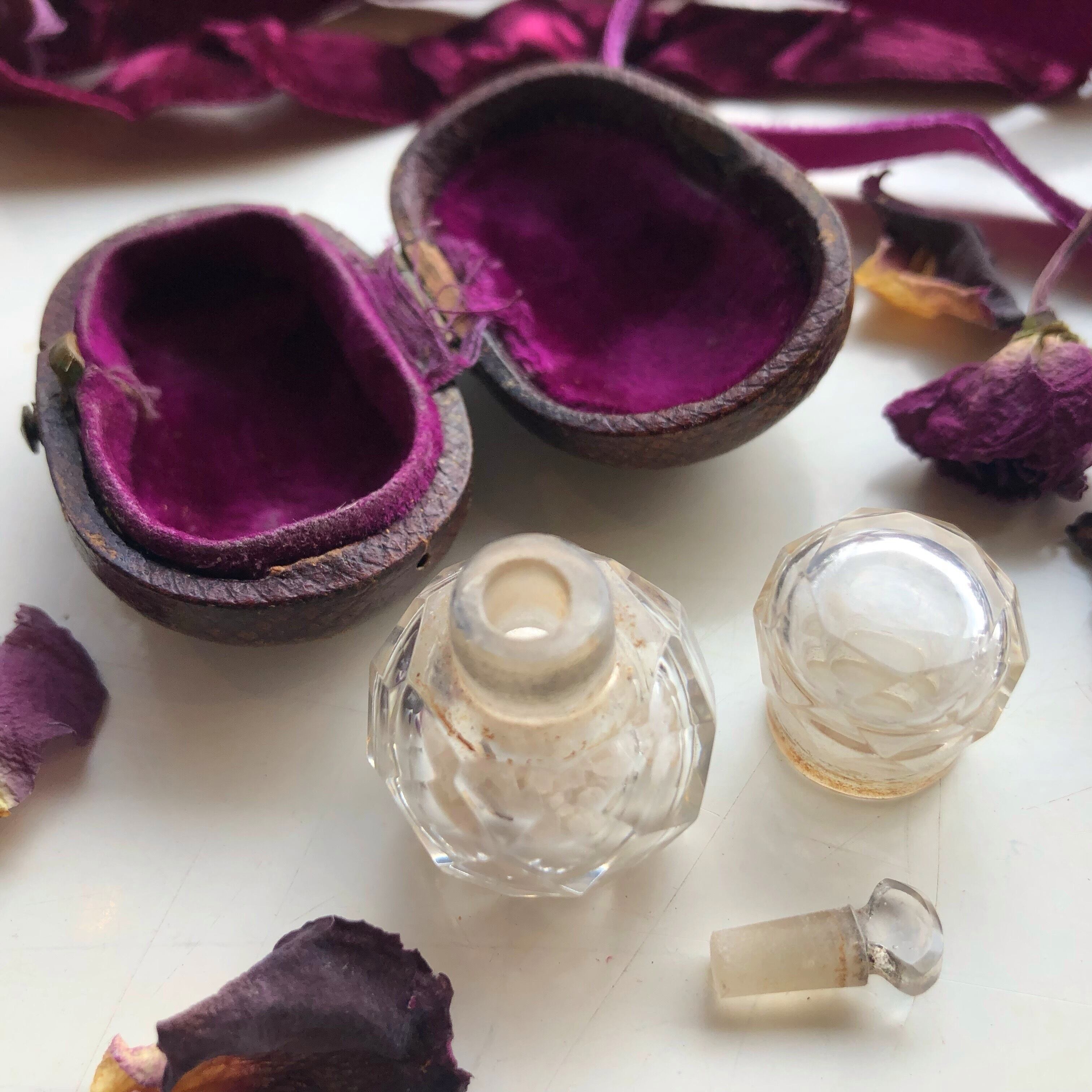 ガラス栓も健在で、開閉もスムーズ。中にさざれ石のようなガラス片のような粒が入っていますが、これは香水を劣化させない為のものだとか。内張りのこっくりしたバーガンディ色も大人っぽく艶やかです。この香水瓶をバッグに忍ばせていた貴婦人はどんな人だったのでしょうね。