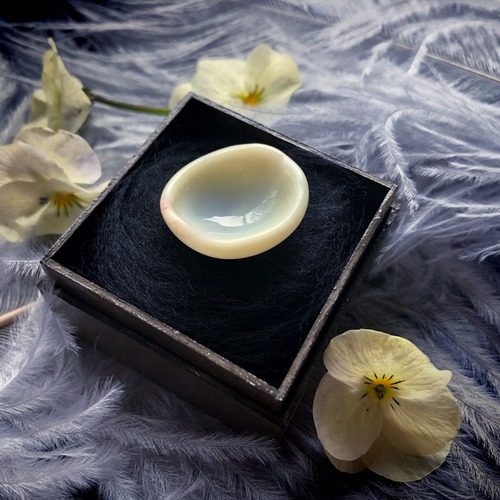 泪の色とはどのようなものなのでしょう。この義眼は青、クリーム、その他少しずつ色味の違う線が立体的に踊っています。ドイツ製ガラス義眼の中には3次元の細工がなされ、奥深い世界が作られているとつくづく思います。それらがすべて絡まり合って、瑞々しい世界の底から泪が湧いてくるのでしょう。そんな想いにさせるお品です。
