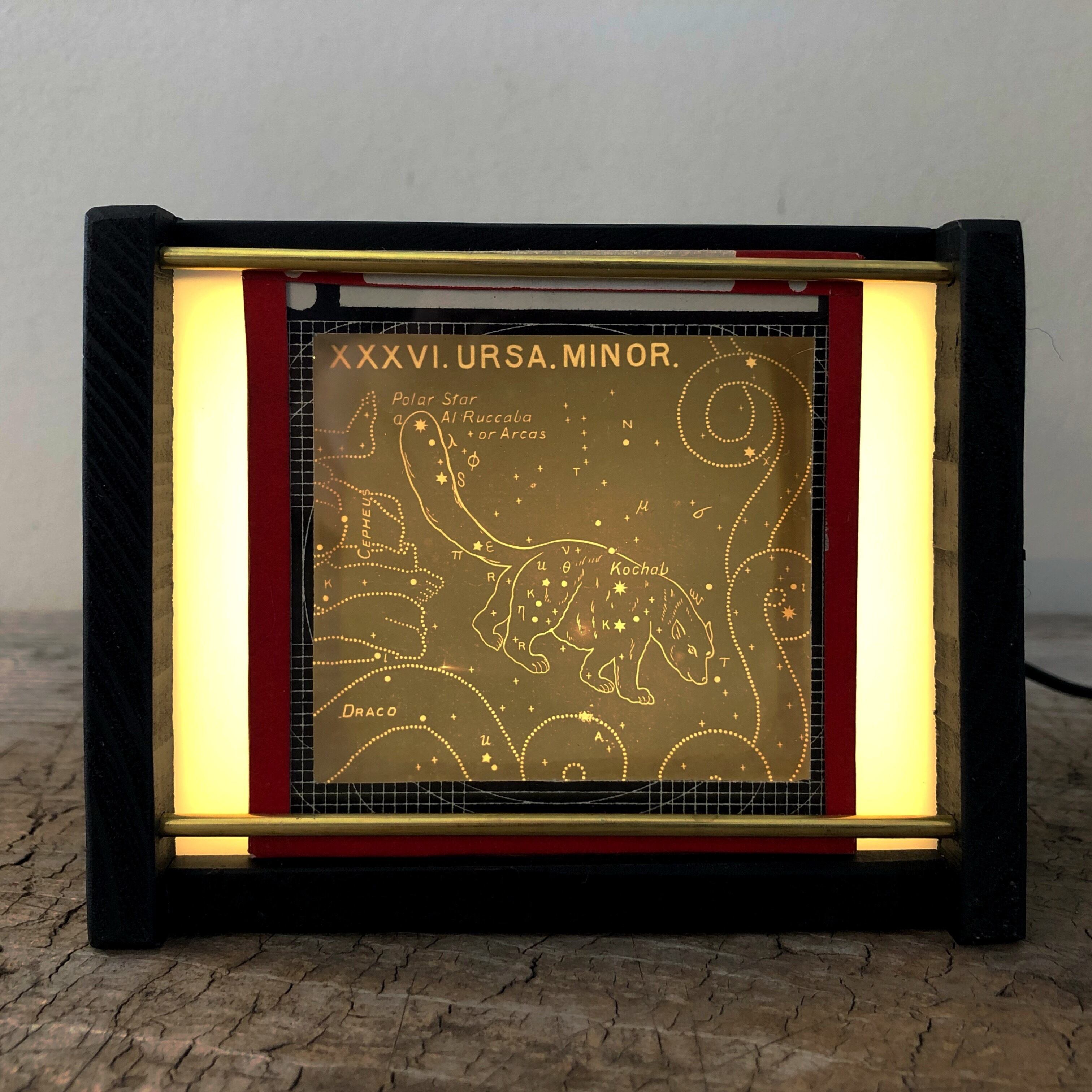 こちらのスライドはこぐま座を中心にいくつかの星座が描かれています。このガラススライドを美しく見る為の幻箱も、それぞれサイズに合わせてレギュラー、中型、大型と別途販売いたします。知的なインテリアや間接照明としてもお楽しみ頂けます。こちらのスライドを展示するためには「レギュラー」の幻箱をお選びください。