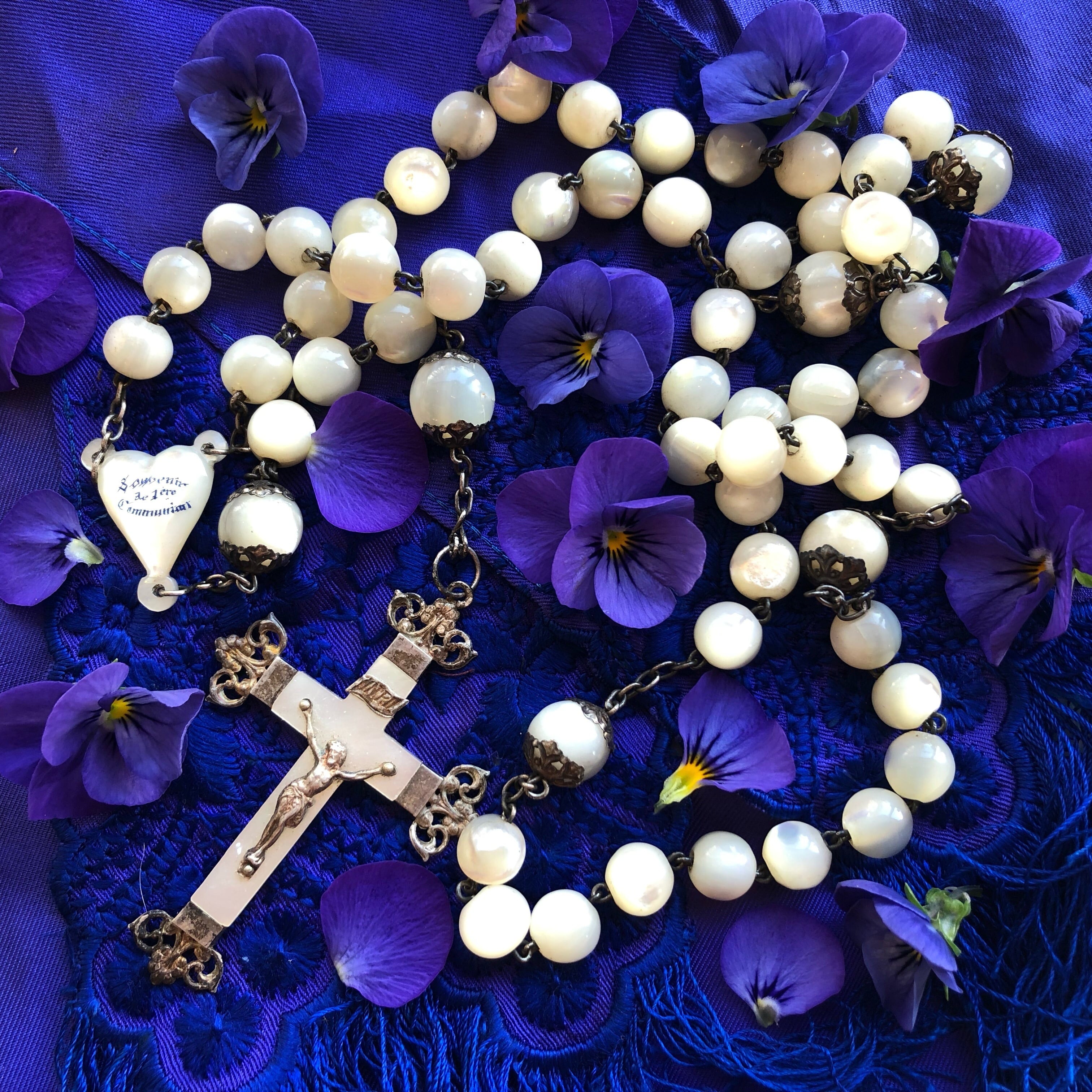 存在感のある真珠貝の玉をあしらったチェーン、クロスも真珠貝に金属の繊細な細工のロザリオです。年を経た天然の貝の少し飴色がかった質感と、真珠貝特有の虹色の光沢がお楽しみいただけます。ロザリオとしては大きめのものです。