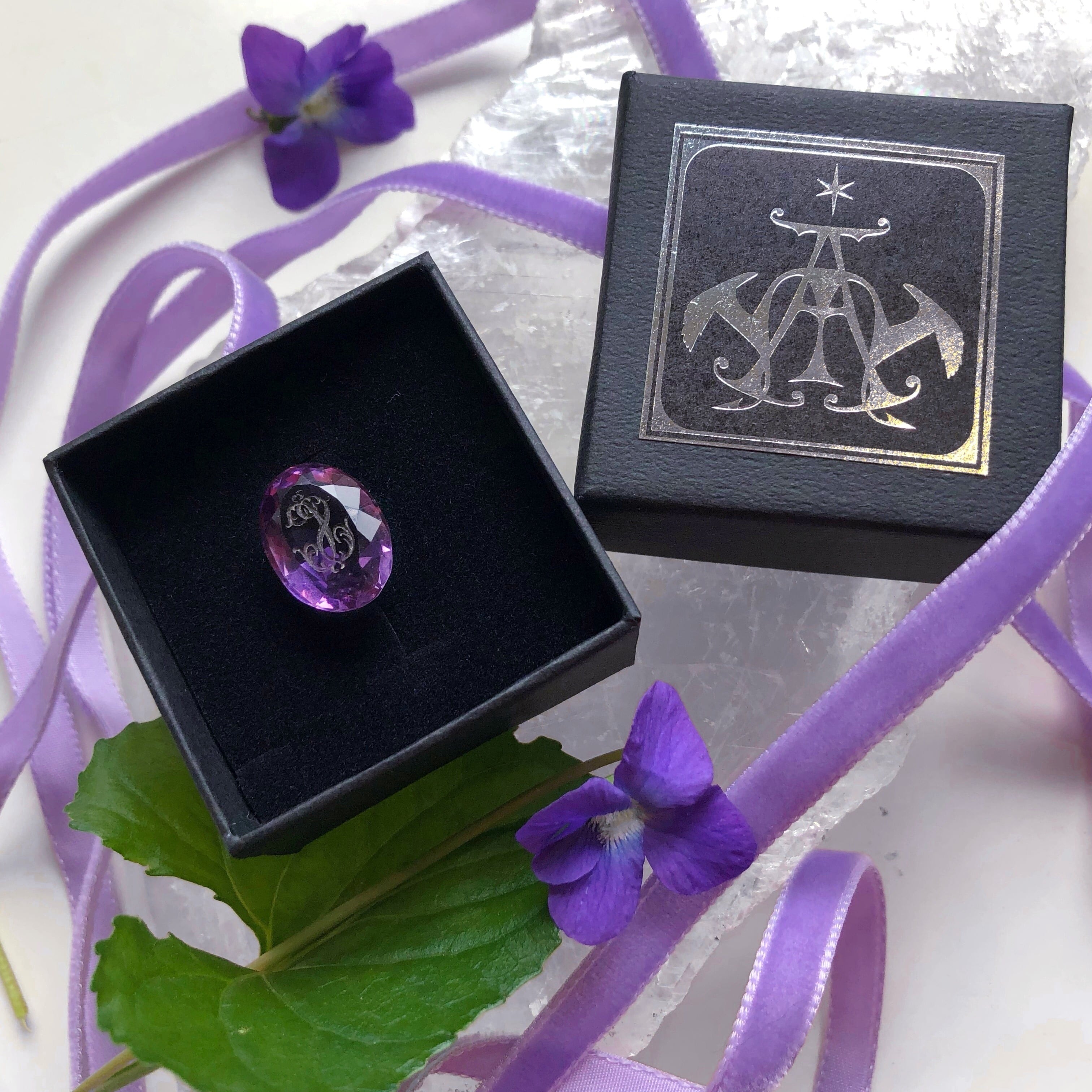 すみれ色のガラスの印章はいかがでしょう。エレガントなモノグラムでSとCが彫られています。カットも美しく優美で高雅。きっと匂い立つような気品のある方の持ち物だったのでしょうね。