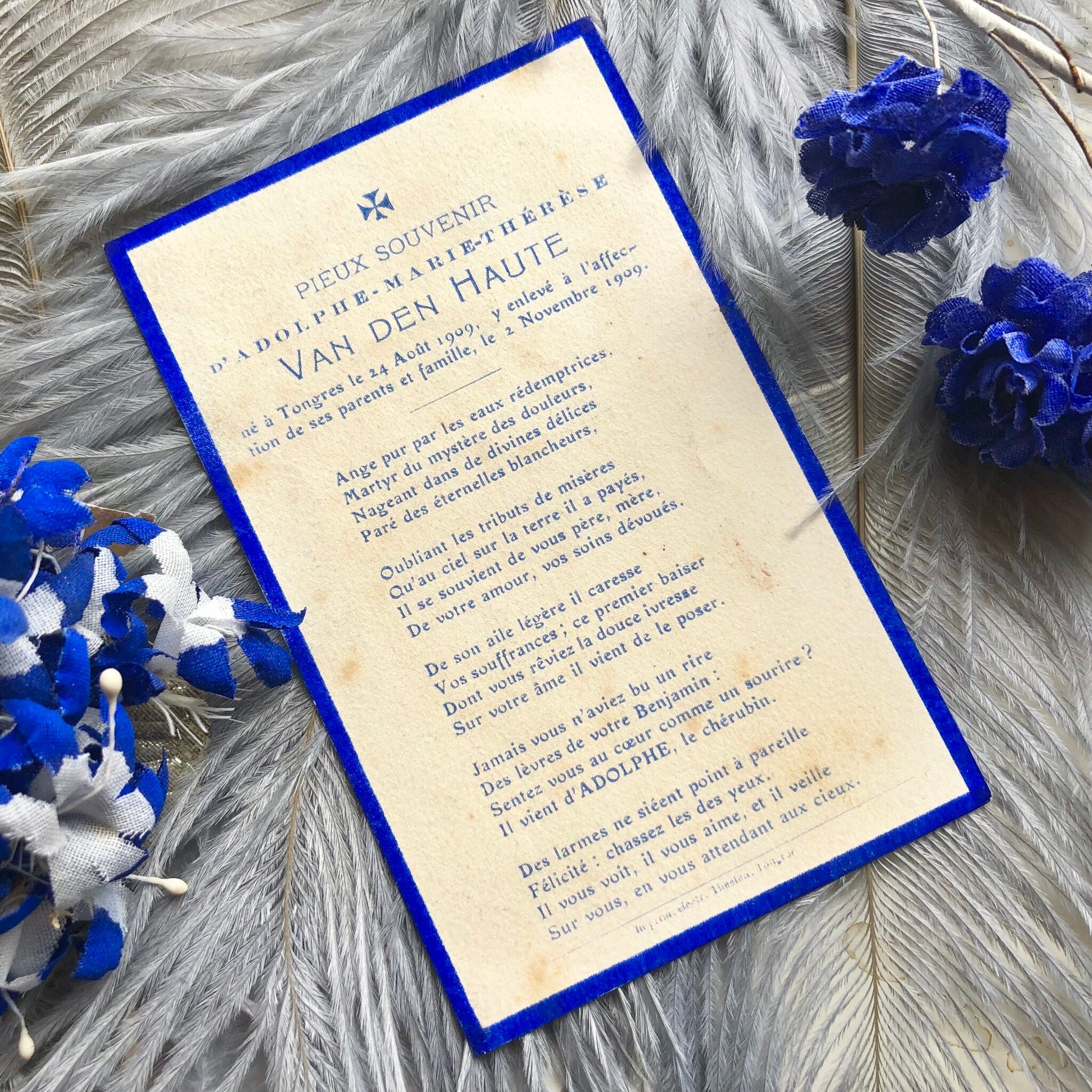 女性の手から天使の手へと移され、天へと向かう幼子。悲しみに満ちたこちらのカードは、1909年8月24日に生まれ、同年11月2日に亡くなった幼子のものです。裏面に、11月2日のこの日、両親、家族の愛情から引き離されたとの記述があります。