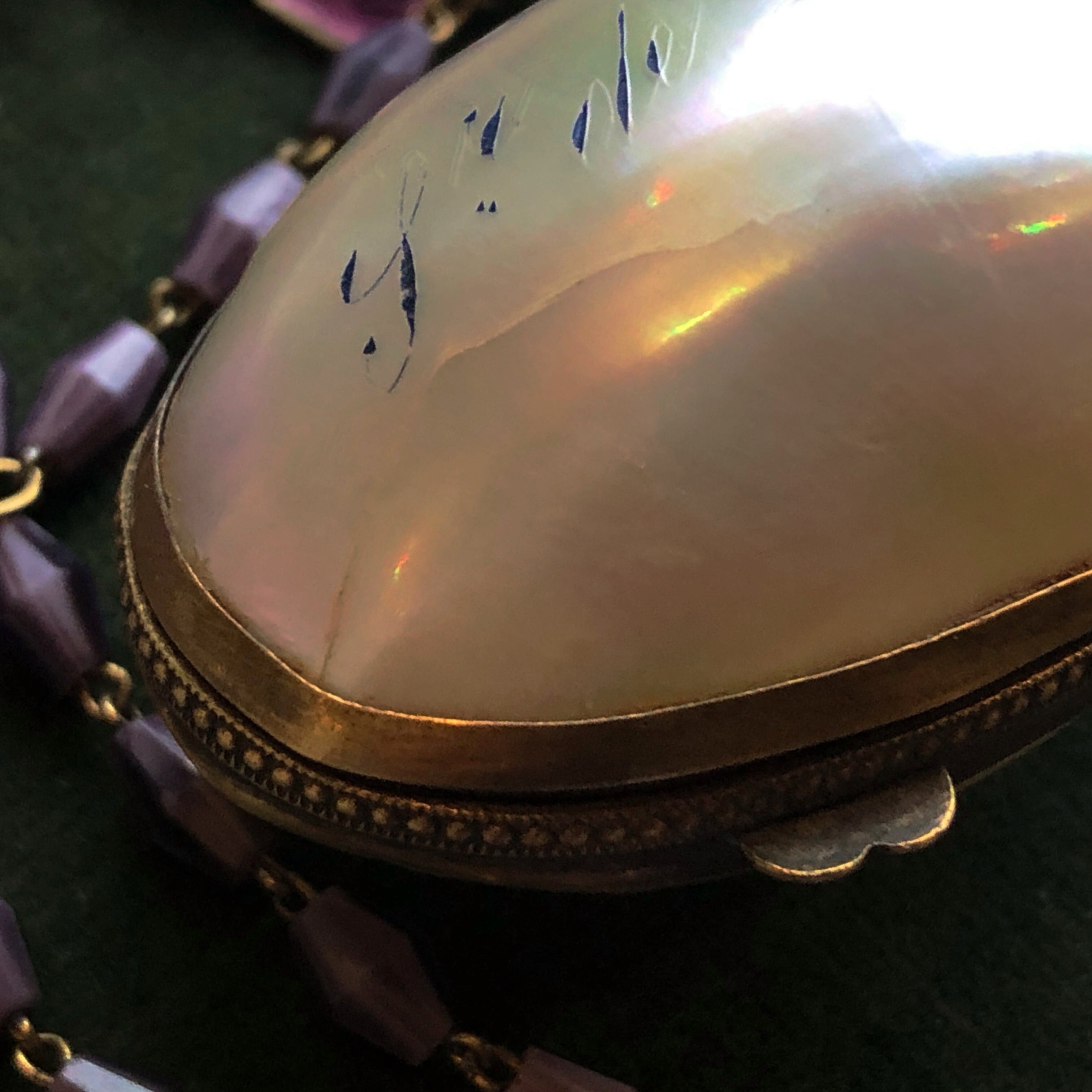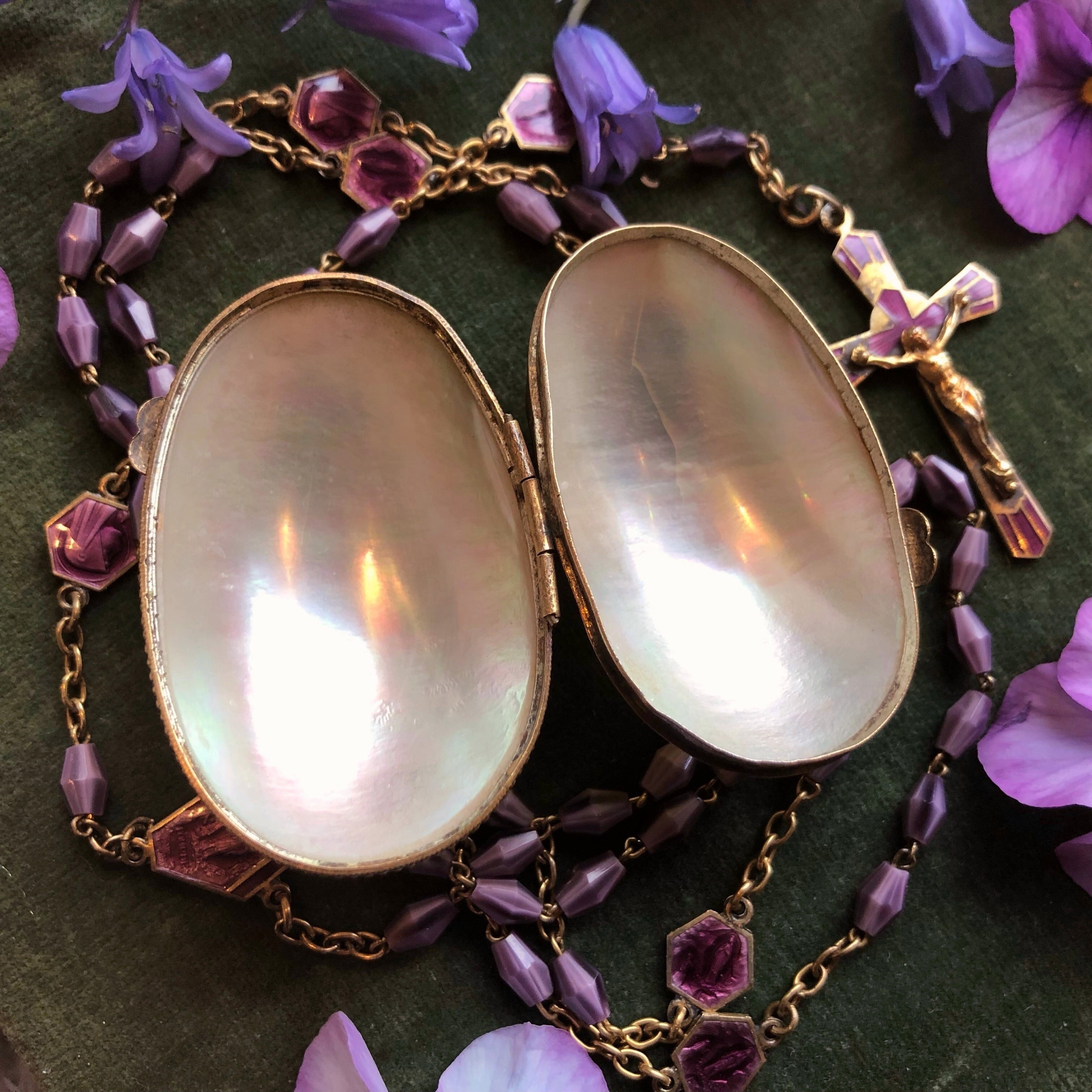 真珠貝で作ったケースと、モーヴのガラスをあしらったロザリオです。