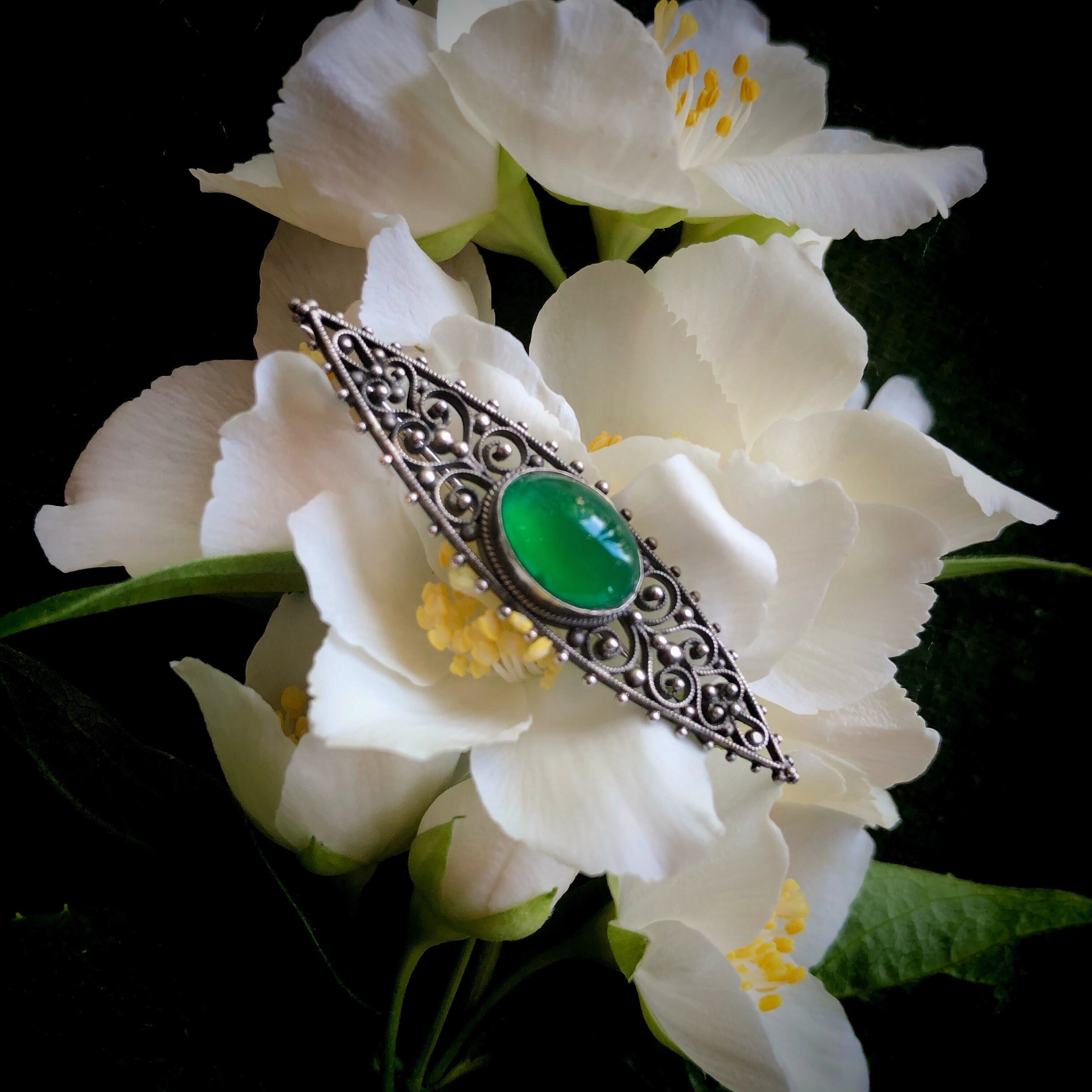 19世紀英国のブローチです。巻いた蔓のような意匠の台座はスターリングシルバーで実に繊細、中央には柔らかな色合いの緑色を上品に配しています。売主はこれをカボションカットのグリーンオニキスと言っていますが、私どもは宝石の専門家ではないので、残念ながら真偽のほどは分かりかねます。