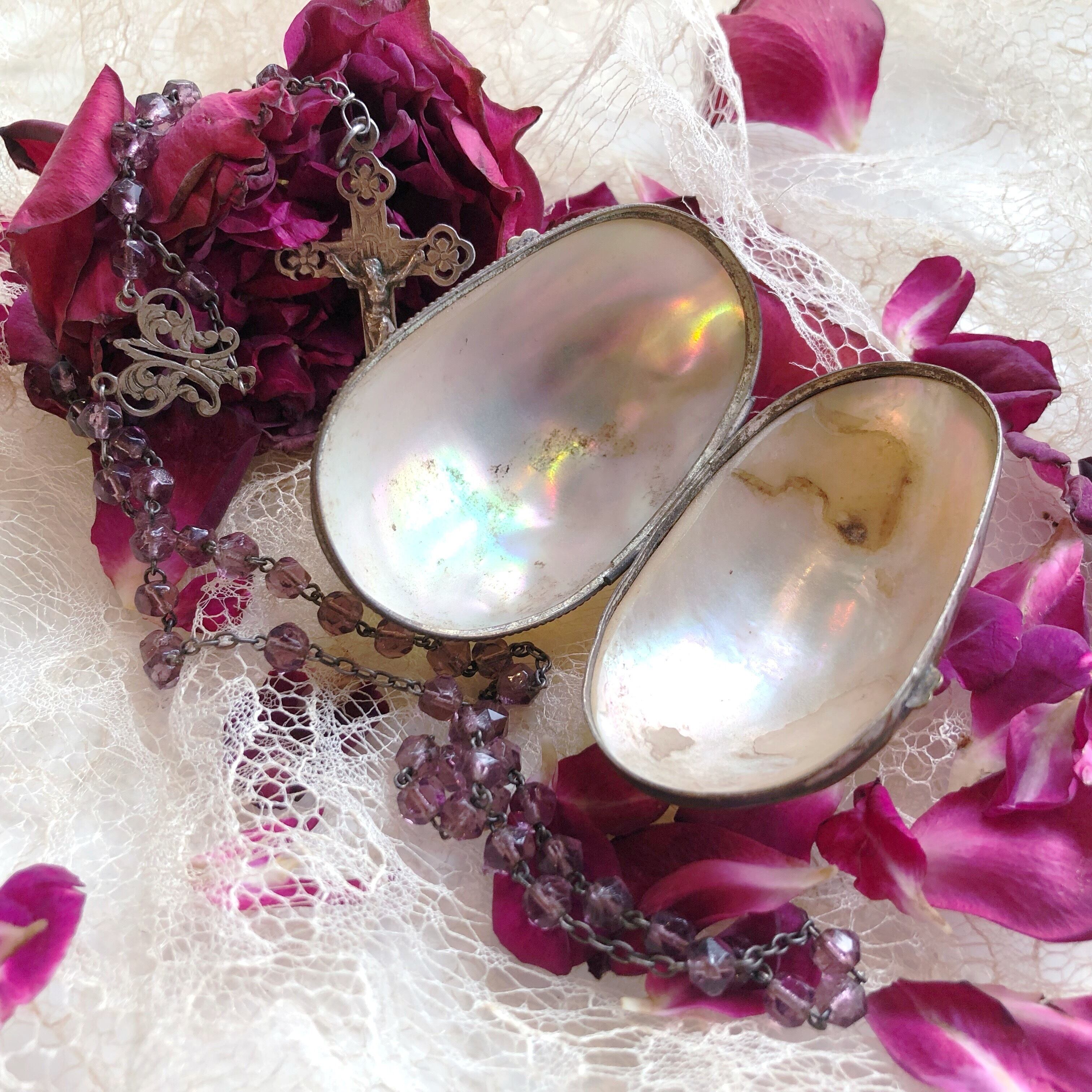 もともと真珠貝のケースはロザリオのケースとして使われることが多く、このケースとロザリオはそれぞれオリジナルではありませんが、相応しい取り合わせだと思います。