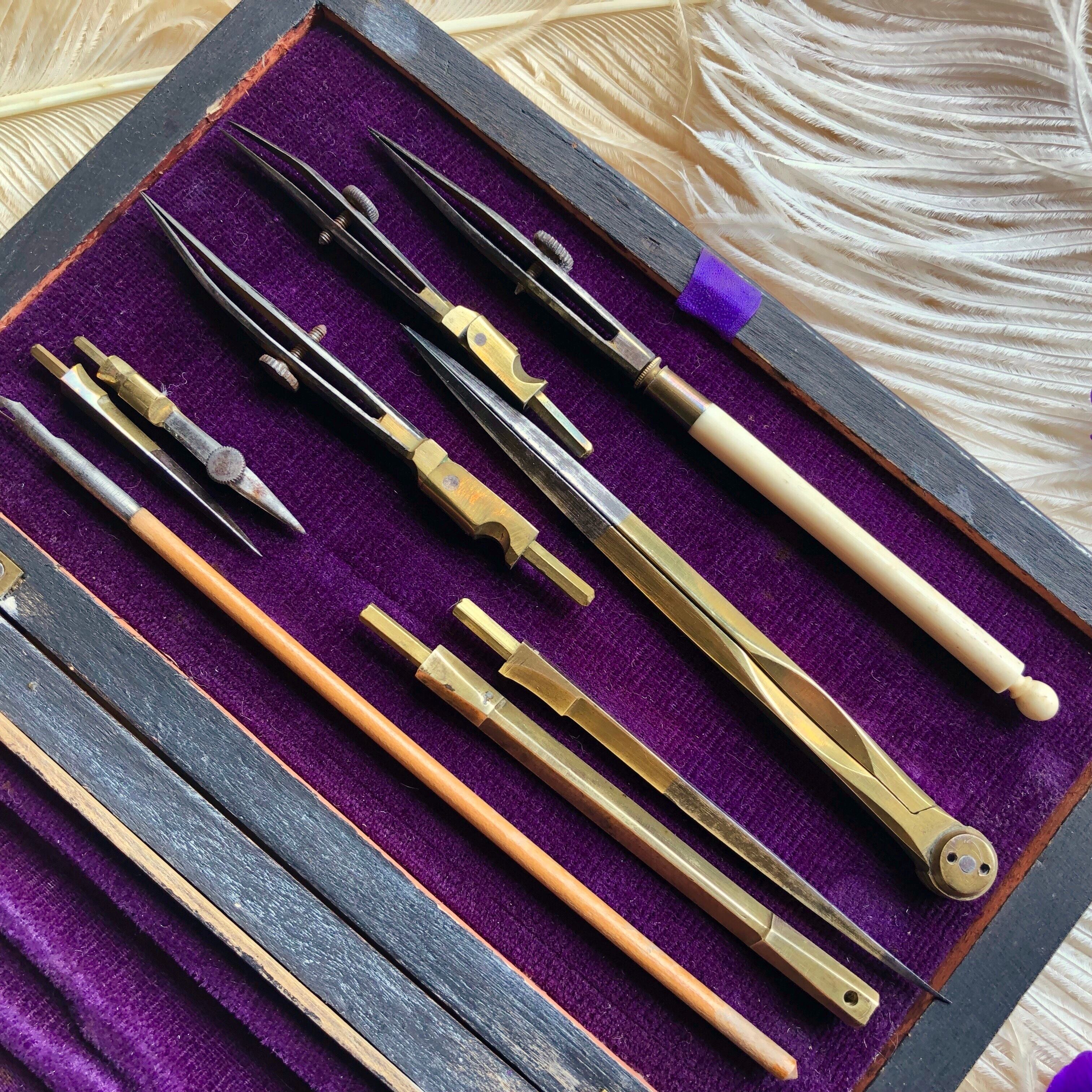 美しい製図用品はいかがでしょう。磨かれた木製のケースの中にはすみれ色のベルベットで内張りがされ、そこに真鍮と鉄を組み合わせたコンパスやカラス口などが並んでいます。全体的にとても豪華な作りです。