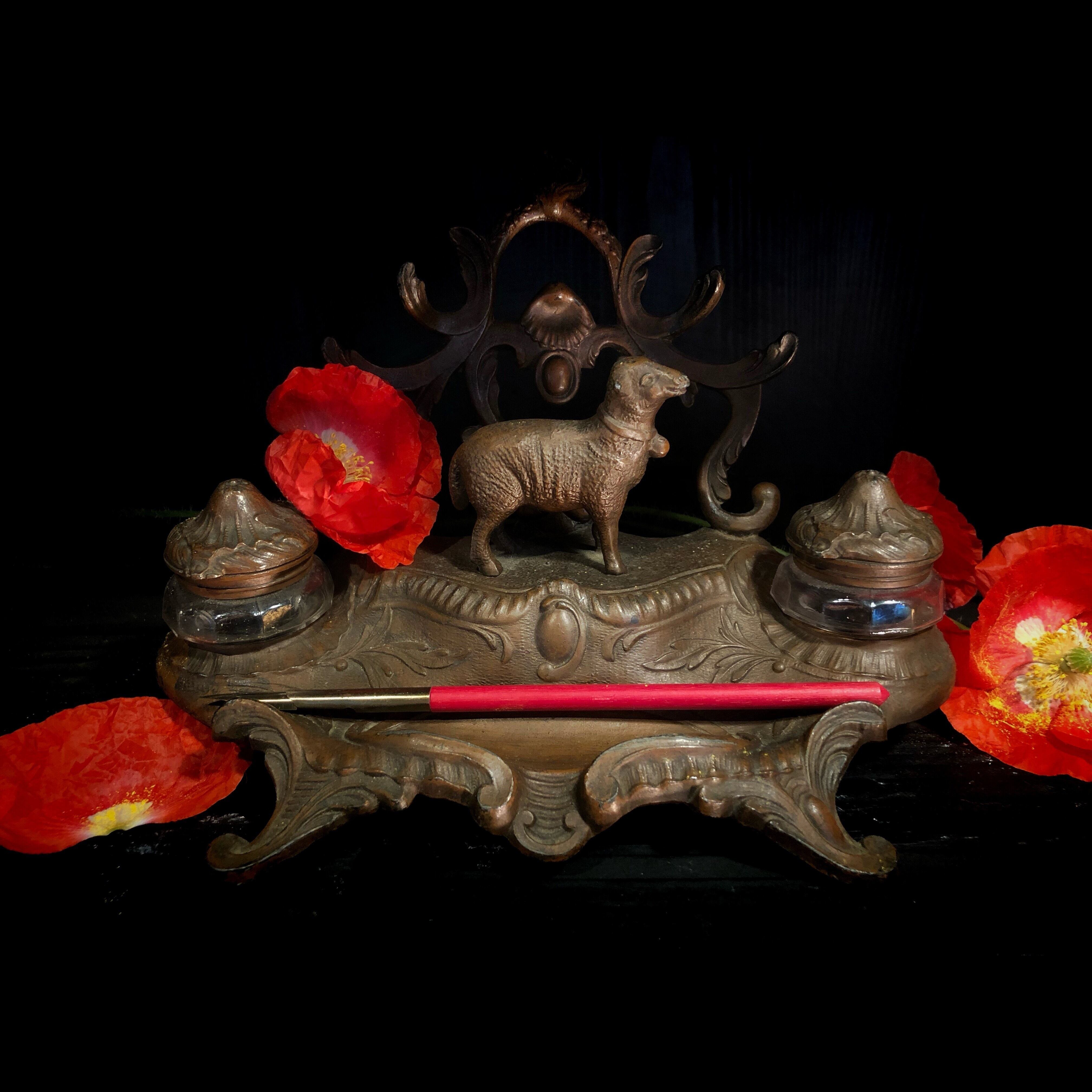 子羊の背後に蔓草、古びた金属の風合いも存在感のあるインクウェルです。もちろんペン置きはありますが、それだけでなく、インクウェルとしては珍しく高さがあるデザインなので、書き終えた手紙や伝言を立てて置いたりもできます。デスクトップのアクセントに最適なお品です。