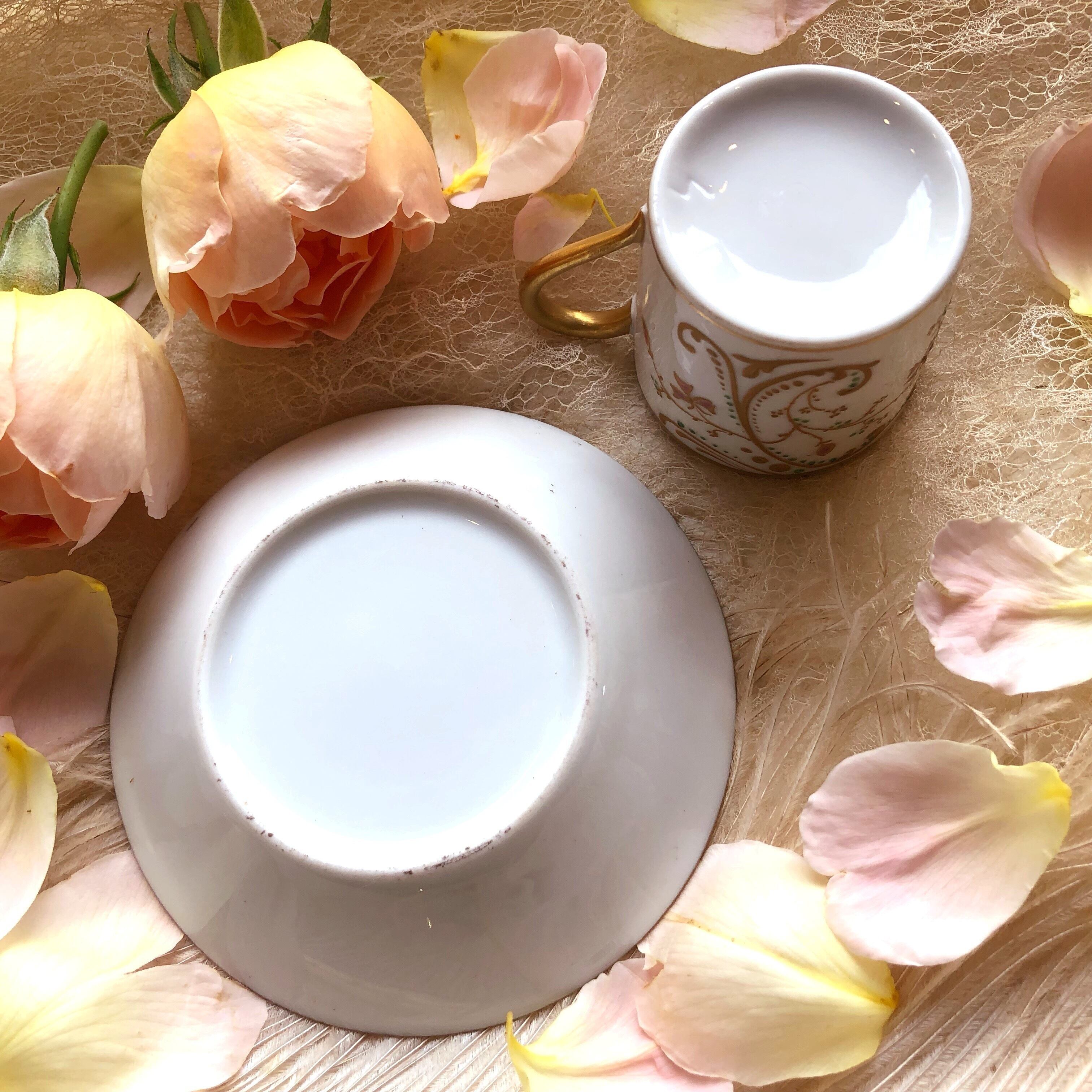 19世紀フランス製。サイズは、カップの飲み口が直径約4.5センチ、高さが約4.7センチ、受け皿の直径が約10センチです。
