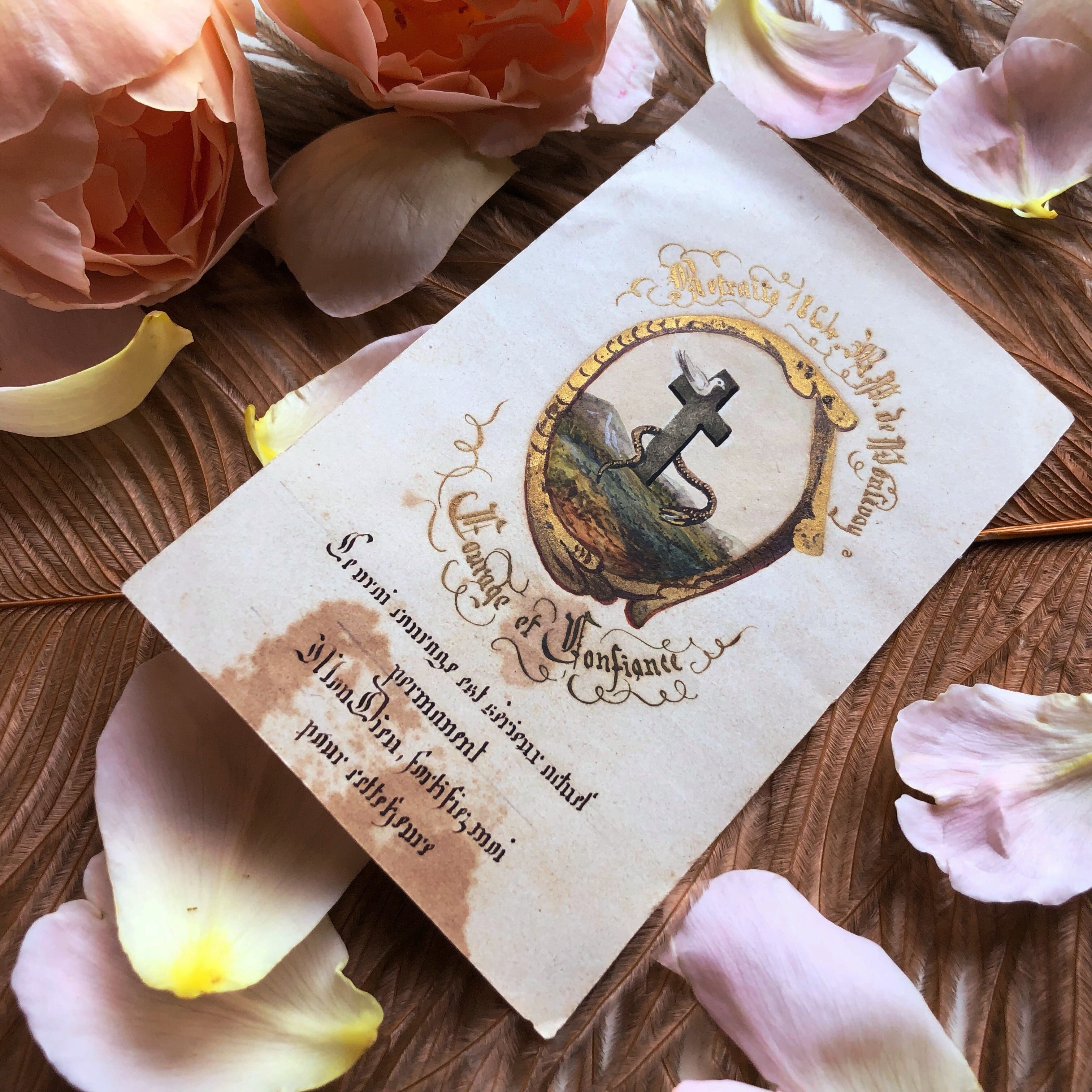 十字架に蛇が巻きつき、鳩がとまっています。手描き、手彩色で金色のインクも使われて、ホーリーカードとしては古いものと思います。
