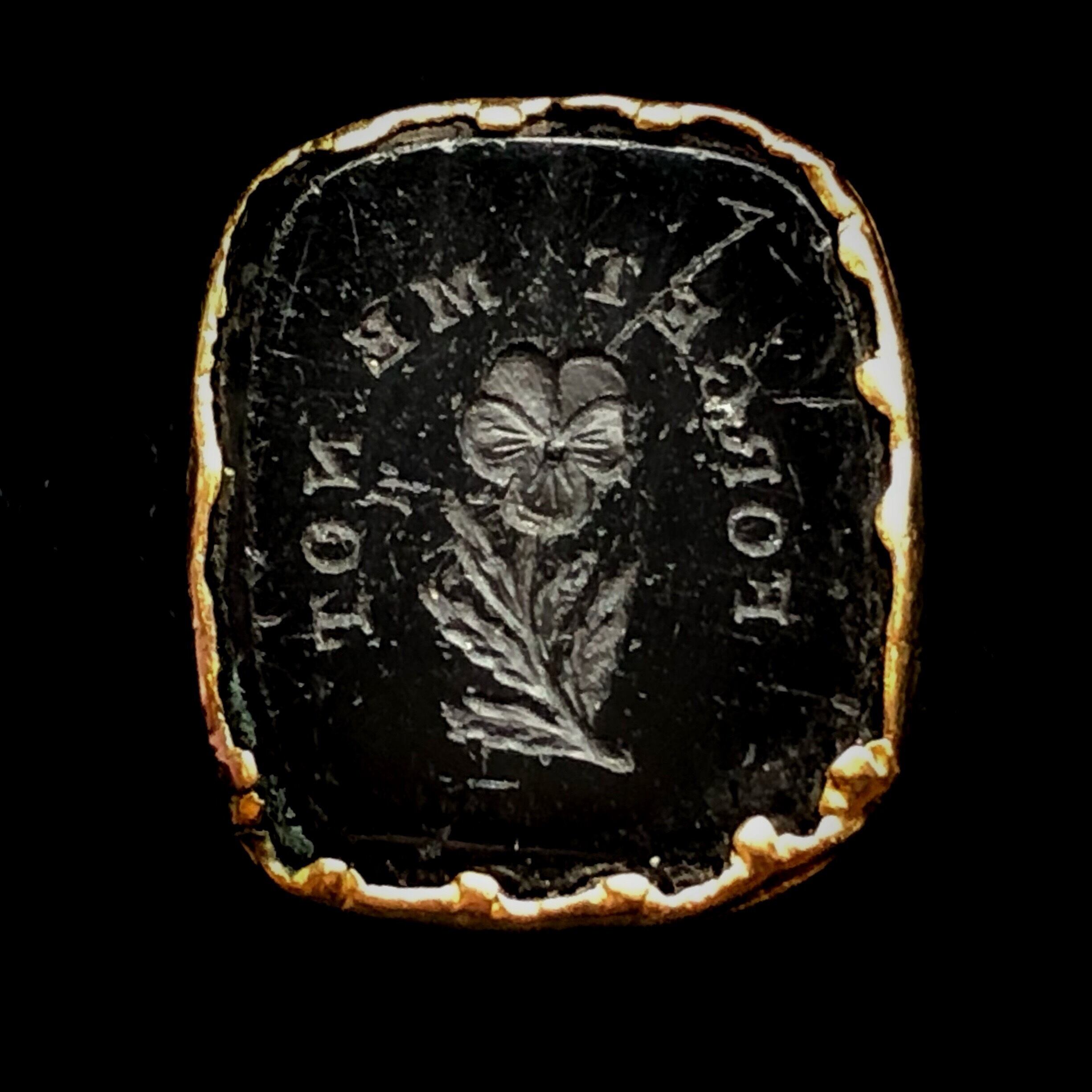 パンジーの印章はいかかでしょう。凝ったフォブには黒いガラスの印章があり「FORGET ME NOT(私を忘れないで)」の文字とパンジーの絵が刻まれています。小さな印章ですが精密な作りで、細部までくっきりとした封印が取れます。