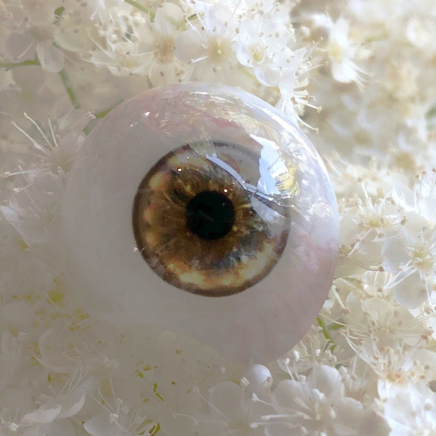 こちらの義眼は本当に複雑です。黒目の周りに明るい茶が滲み、黒目はその上に浮いています。その外側はさらに明るい茶、ほとんど金色とでも言いたくなるような色味を背景に白と黒の線が踊るのです。そこに青も垣間見えながら、外縁はウォームグレーに沈んでいきます。