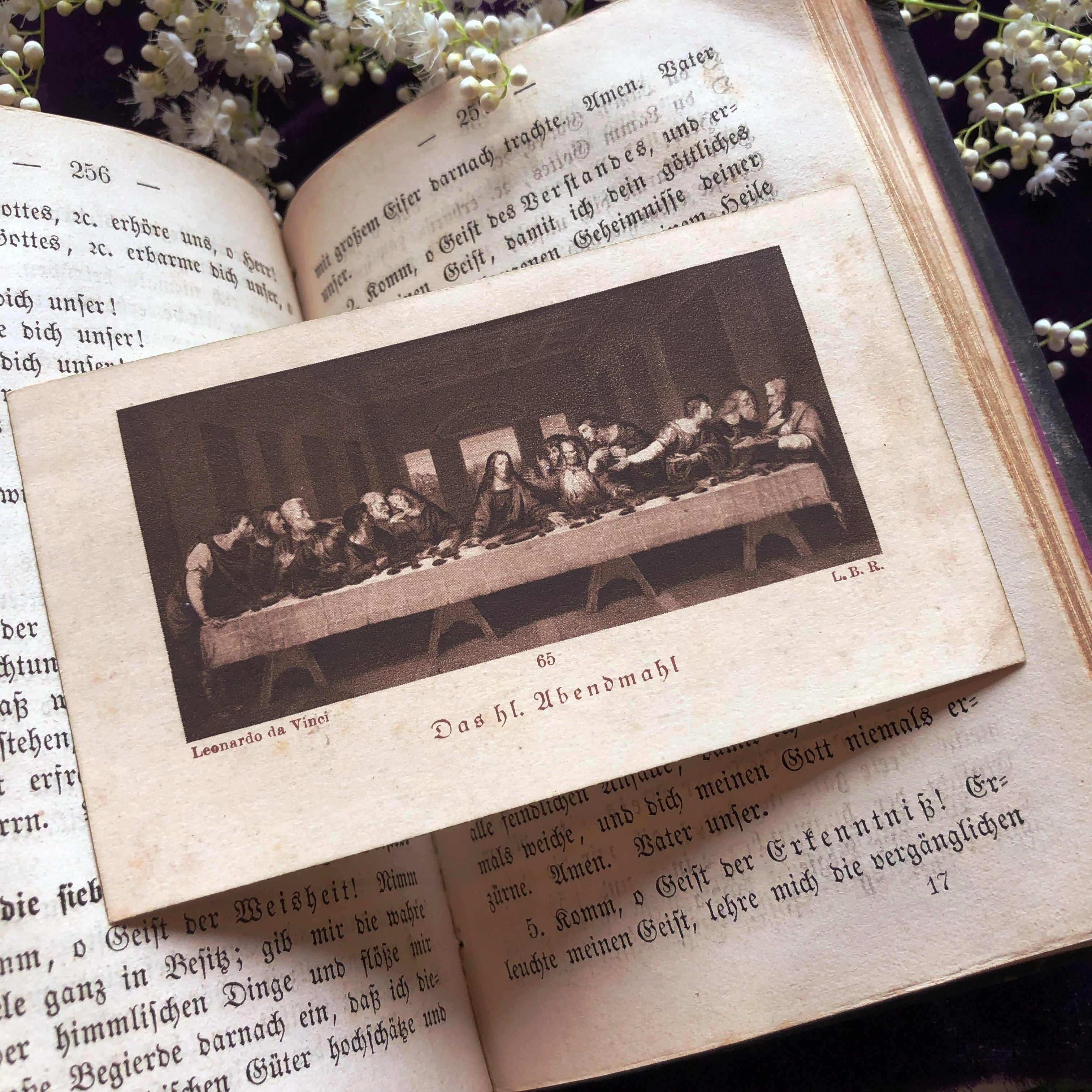 中にも、銅版の図版が何点かあり、256~257ページには最後の晩餐のホーリーカードが挟まれていました。以前の持ち主が何かの記念か思い出に挟んでおいたものでしょう。