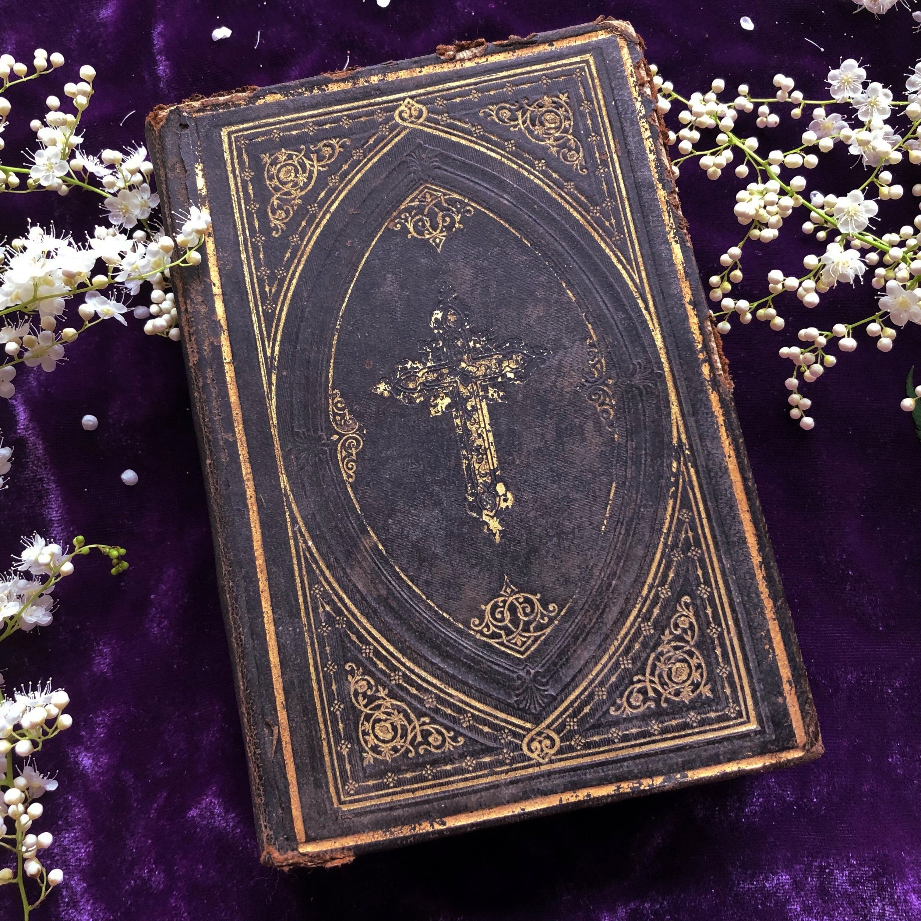 古いもののため装丁に擦れや傷みもありますが、背表紙の天使たち、裏表紙の聖杯などが金色で描かれ、凝った造りが各所に見られます。