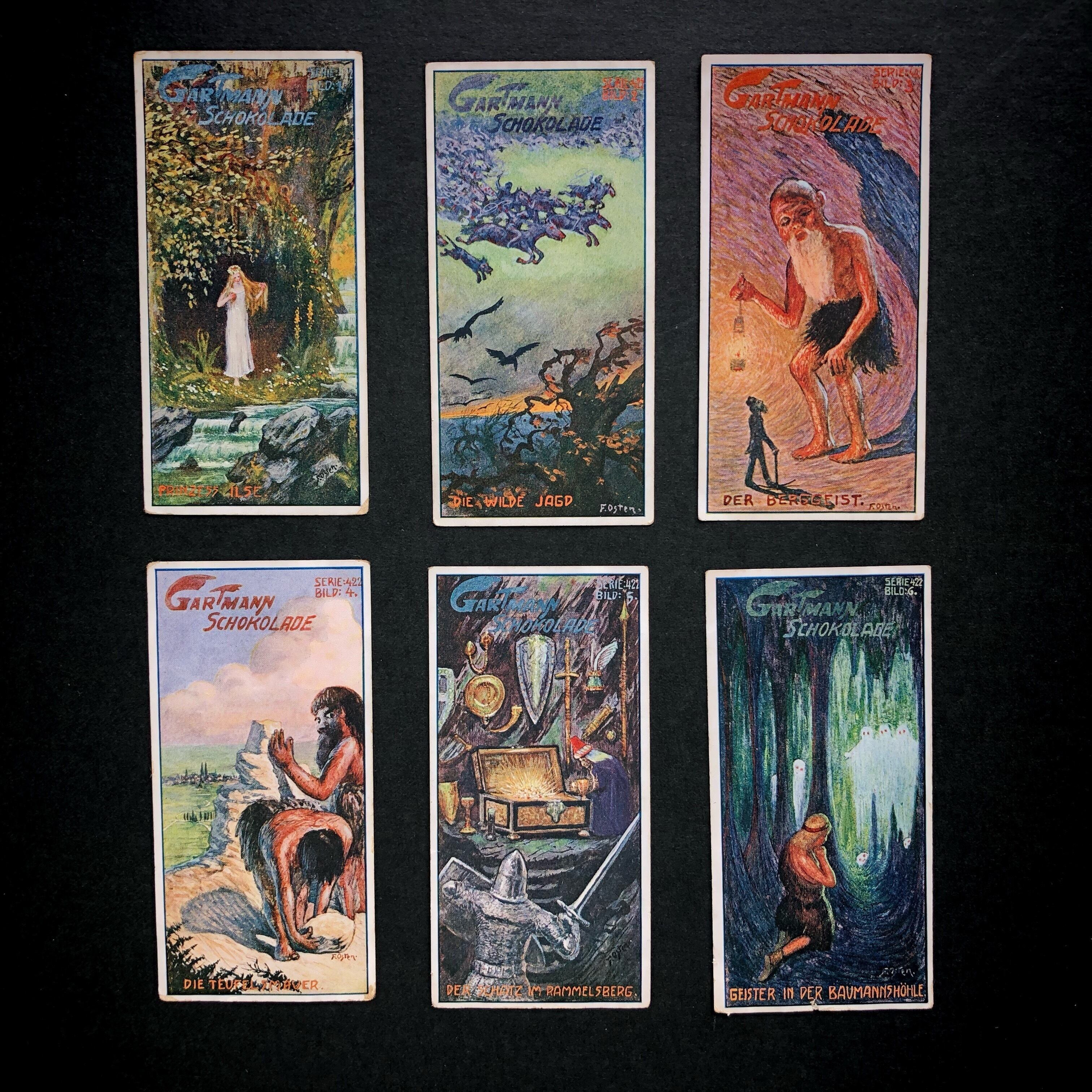 こちらは山に関連する言い伝えのシリーズのようで、「山の精霊」「ランメンスベルク鉱山の宝」「洞窟の幽霊」「悪魔の壁」「野生の狩」「プリンセス イルゼ」の全6枚セットのカードです。ドイツの鬱蒼とした木々の、深い森の奥に息づく怪しさに溢れています。