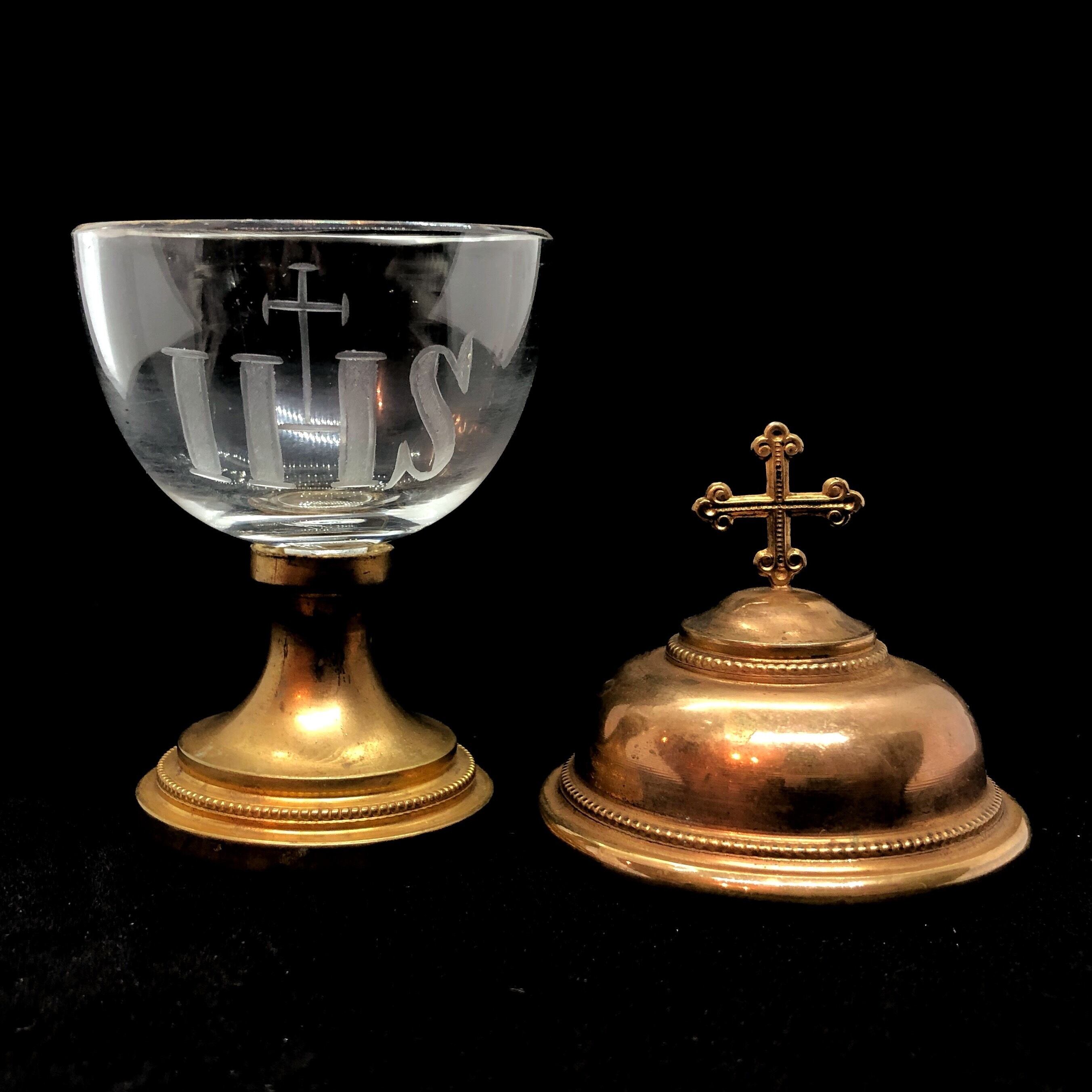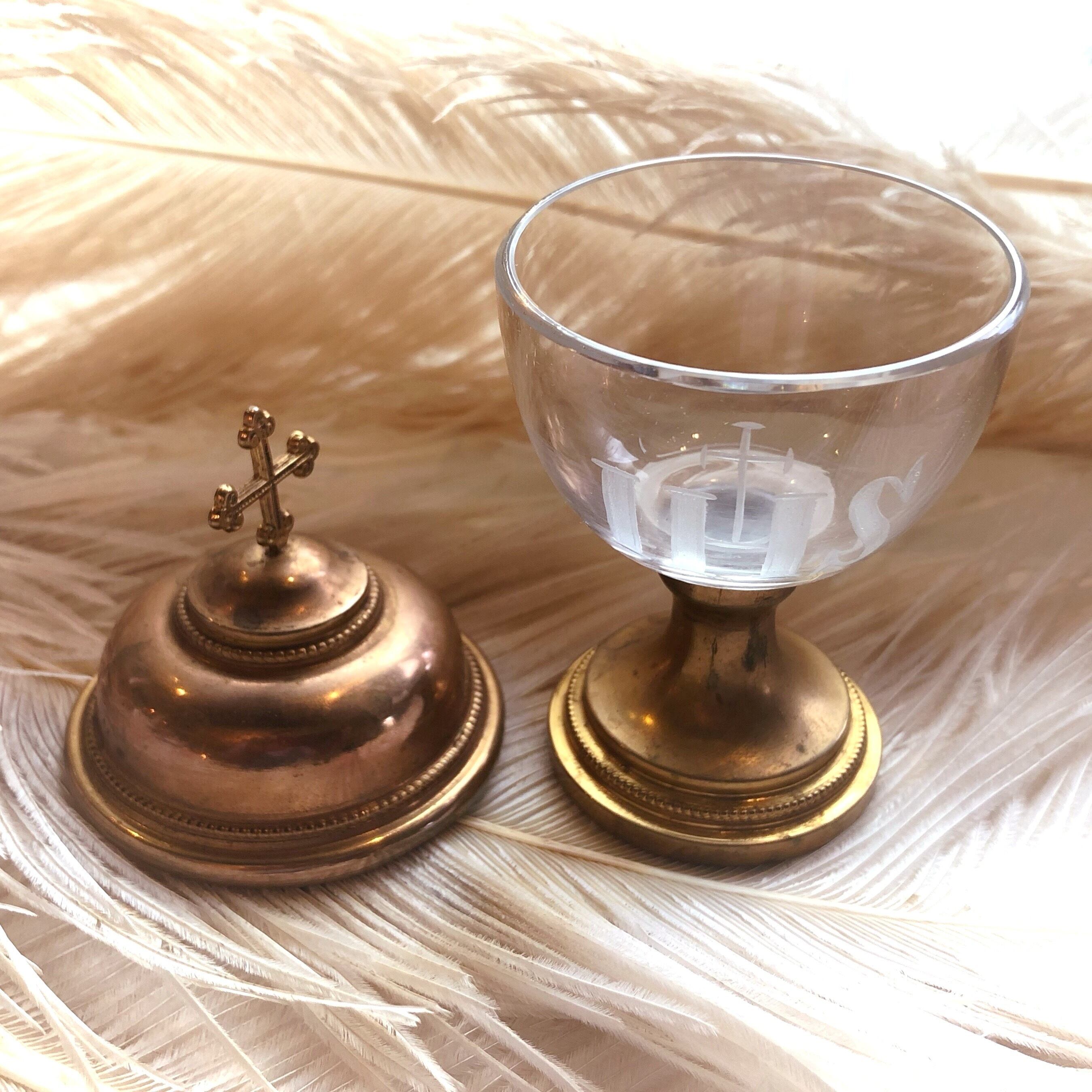 19世紀、ガラスと真鍮、フランス製。サイズは、ガラスの口の部分が直径約6センチ、全体の高さが約12.5センチです。