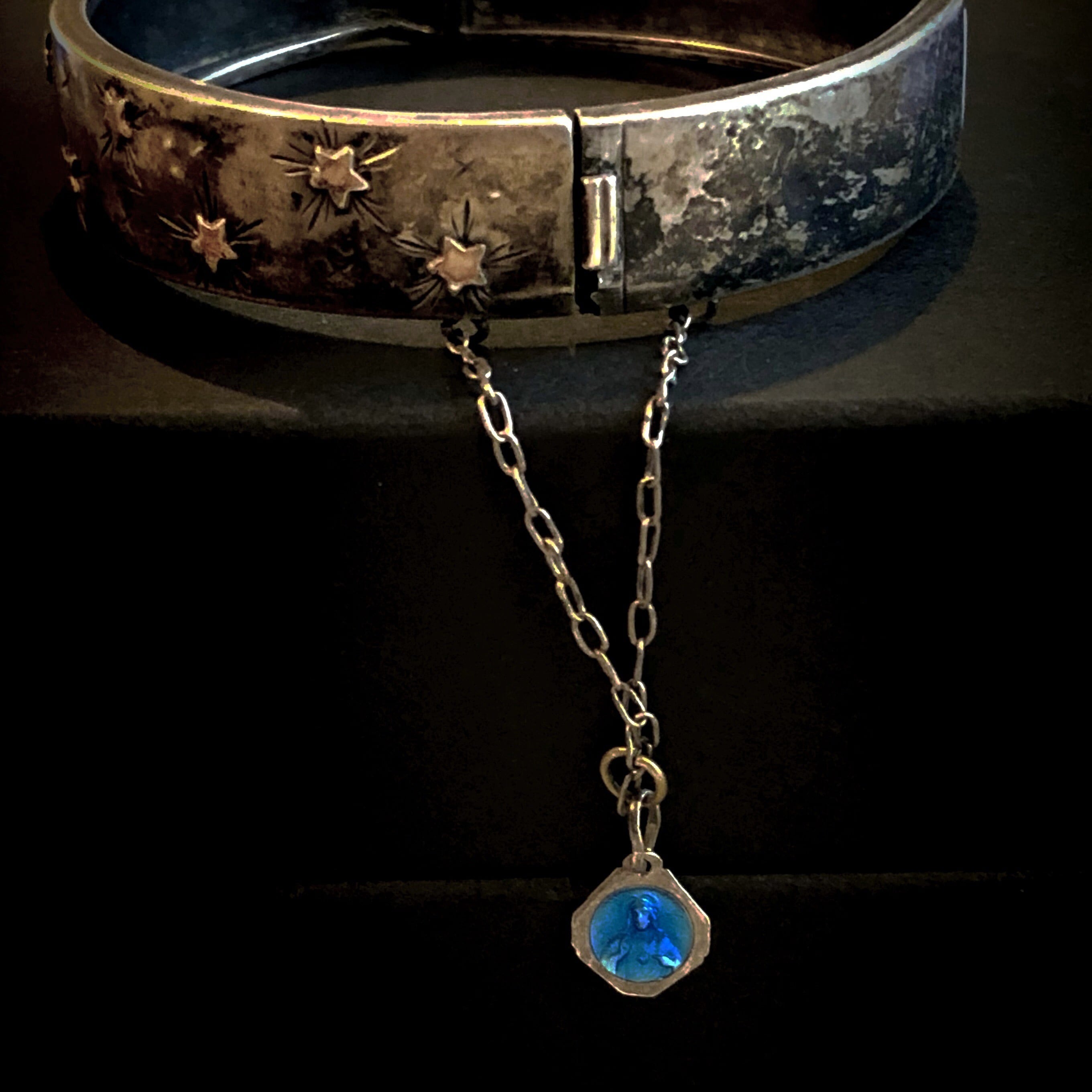 星のバングルはいかがでしょう。パカッと開くようになっていて、開いても落ちないようにチェーンがついています。チェーンの先にはブルーのエナメルの小さなメダイがついています。ホールマークがあるようですが、小さく磨耗しているのでよく読み取れません。多分シルバーだと思います。