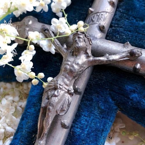 青いベルベットの聖水入れはいかがでしょう。キリスト教では身を清める時に、聖水入れに入れた聖水に指を浸して十字を切ります。その為、聖水を入れるお皿がついています。裏にフックがあり、壁に掛けられるようになっていてインテリアとしても素敵です。