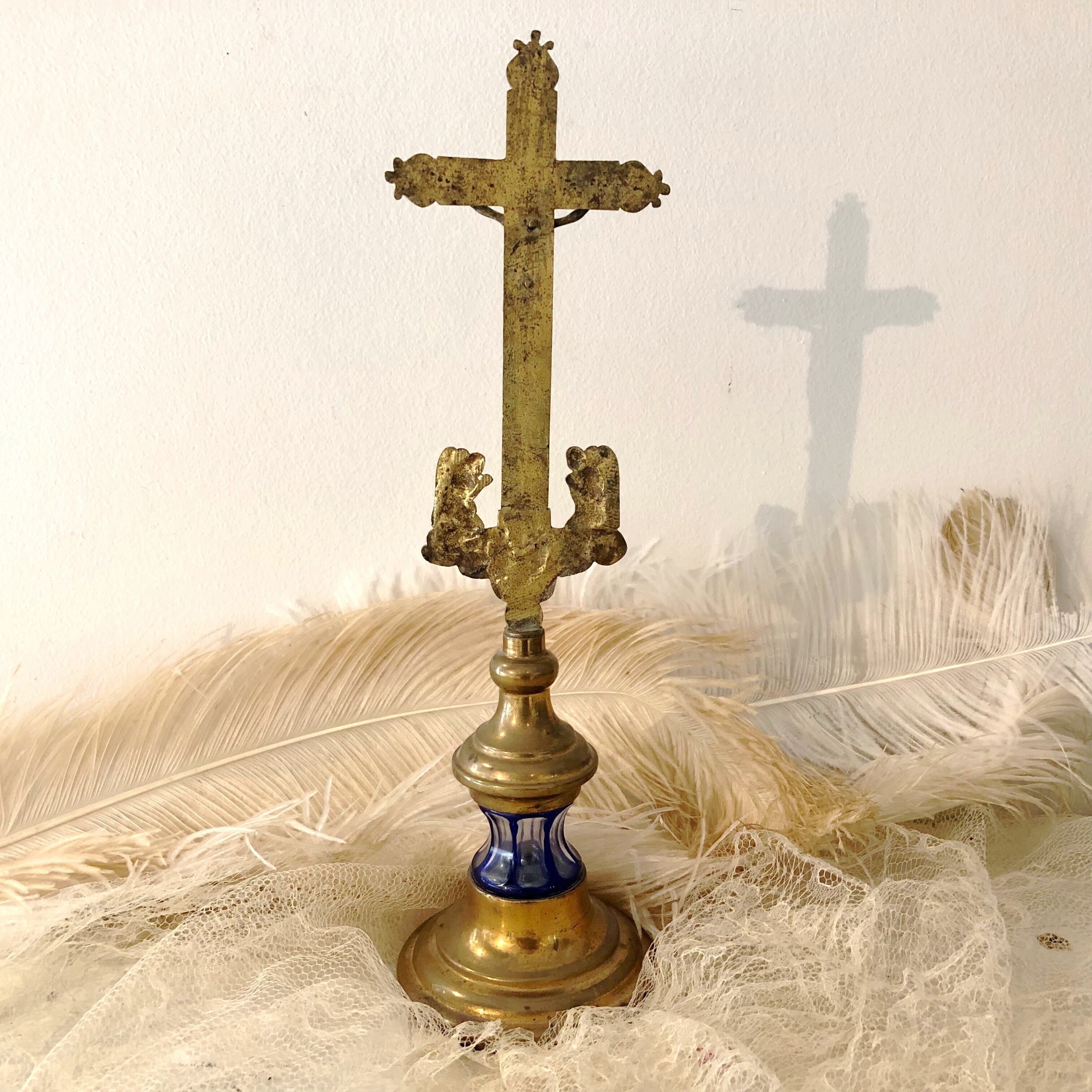 ガラスの入った十字架はいかがでしょう。真鍮製の十字架は高さ34センチの大きさ。十字架の足元には祈る天使達、智天使、熾天使達が見えます。また根元には青いガラスが入っていて、光に透けるととても綺麗。