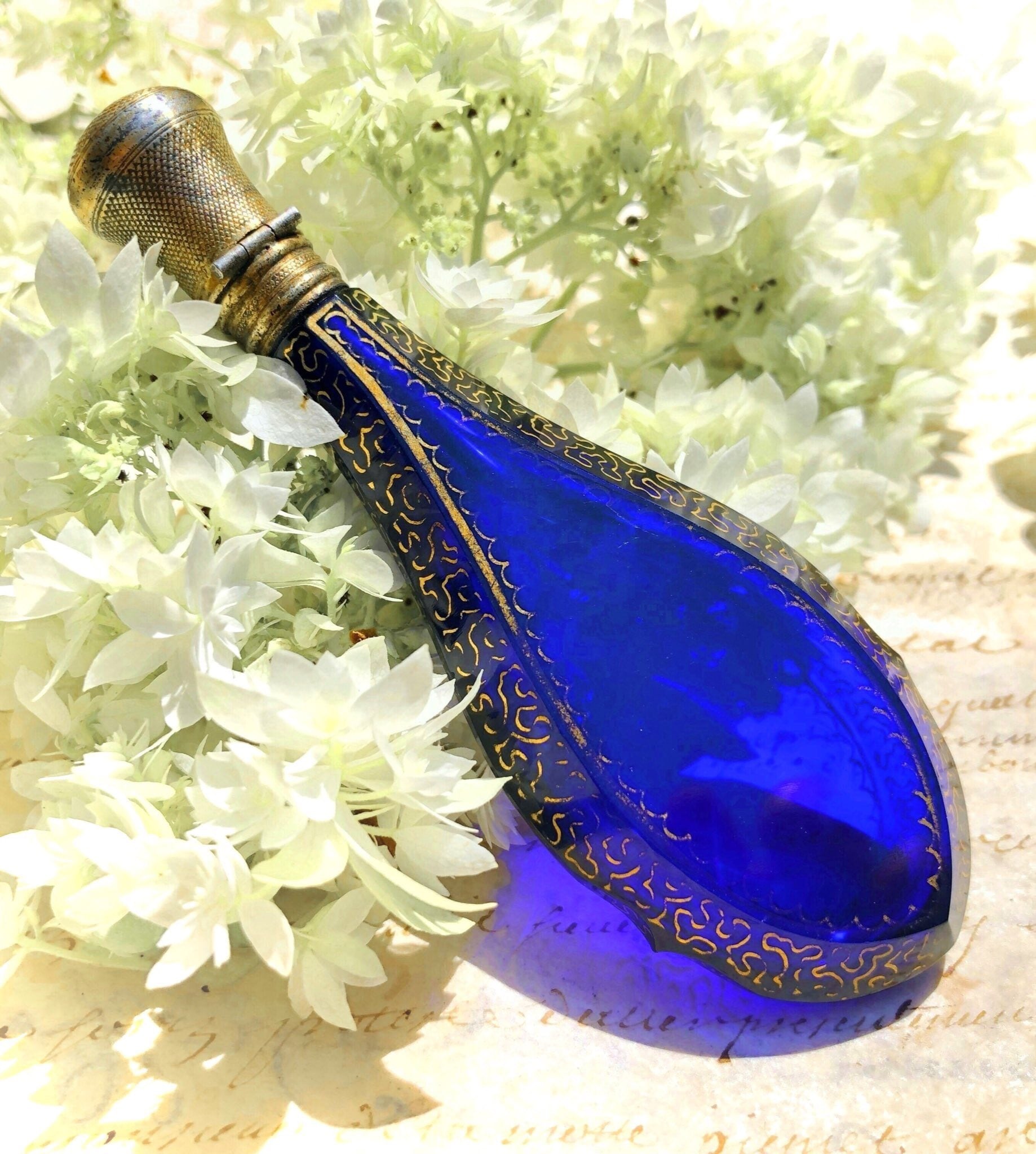 コバルトブルーの香水瓶はいかがでしょう。泪型の青いクリスタルガラスには鮮やかな金彩が。内蓋のガラスの栓も健在で、使用可能と思われます。蓋にはホールマークが付いていますが、磨耗していて読み取れません。優美ですがどこか凛々しく毅然といていますね。