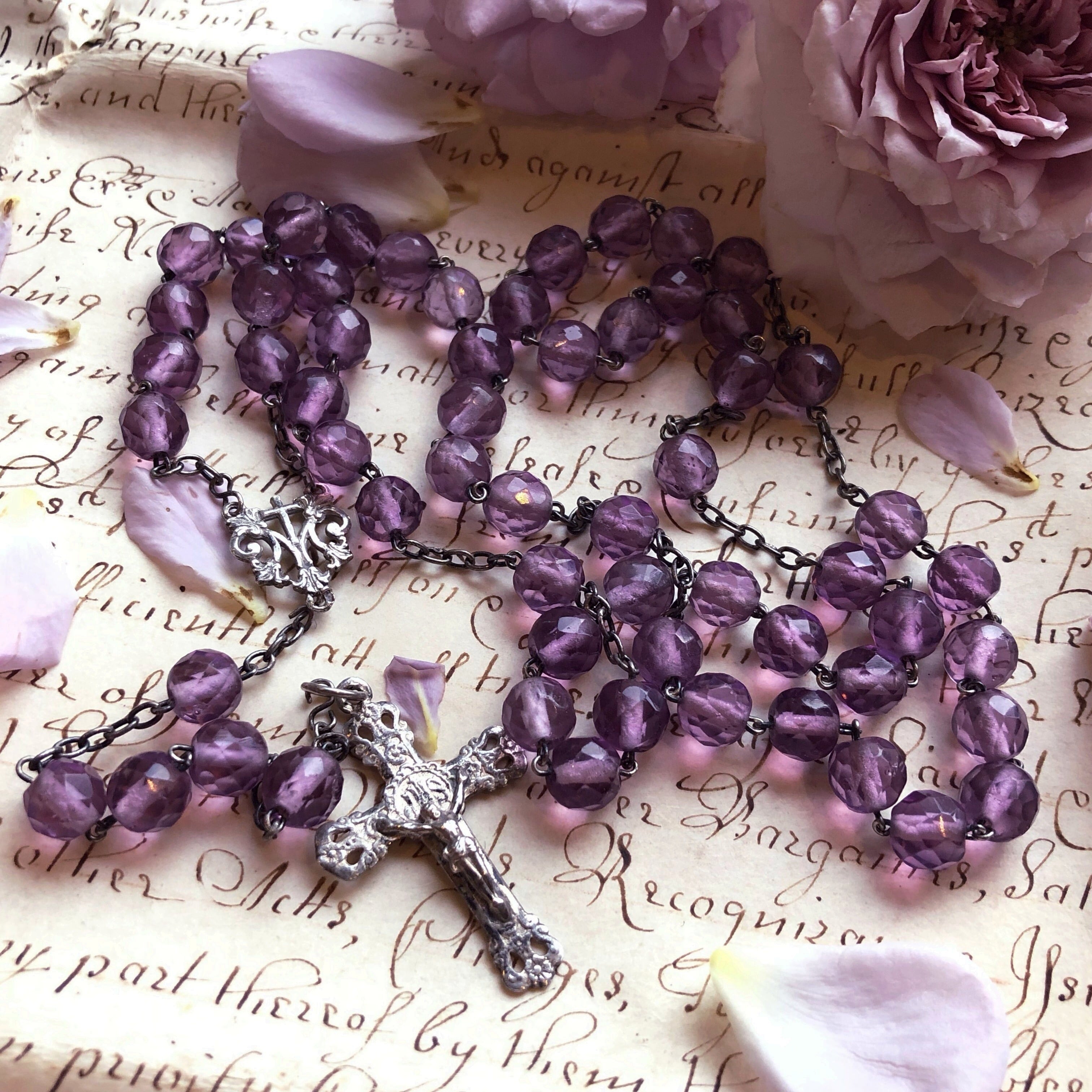 アメジスト色のガラスビーズをあしらったロザリオです。クロスの造りも細かく、表裏ともにしっかりと模様が刻まれています。チェーンとクロスを繋ぐプレートもただの板ではなく、マリア様を表すAとMのモノグラムの凝ったデザインになっています。