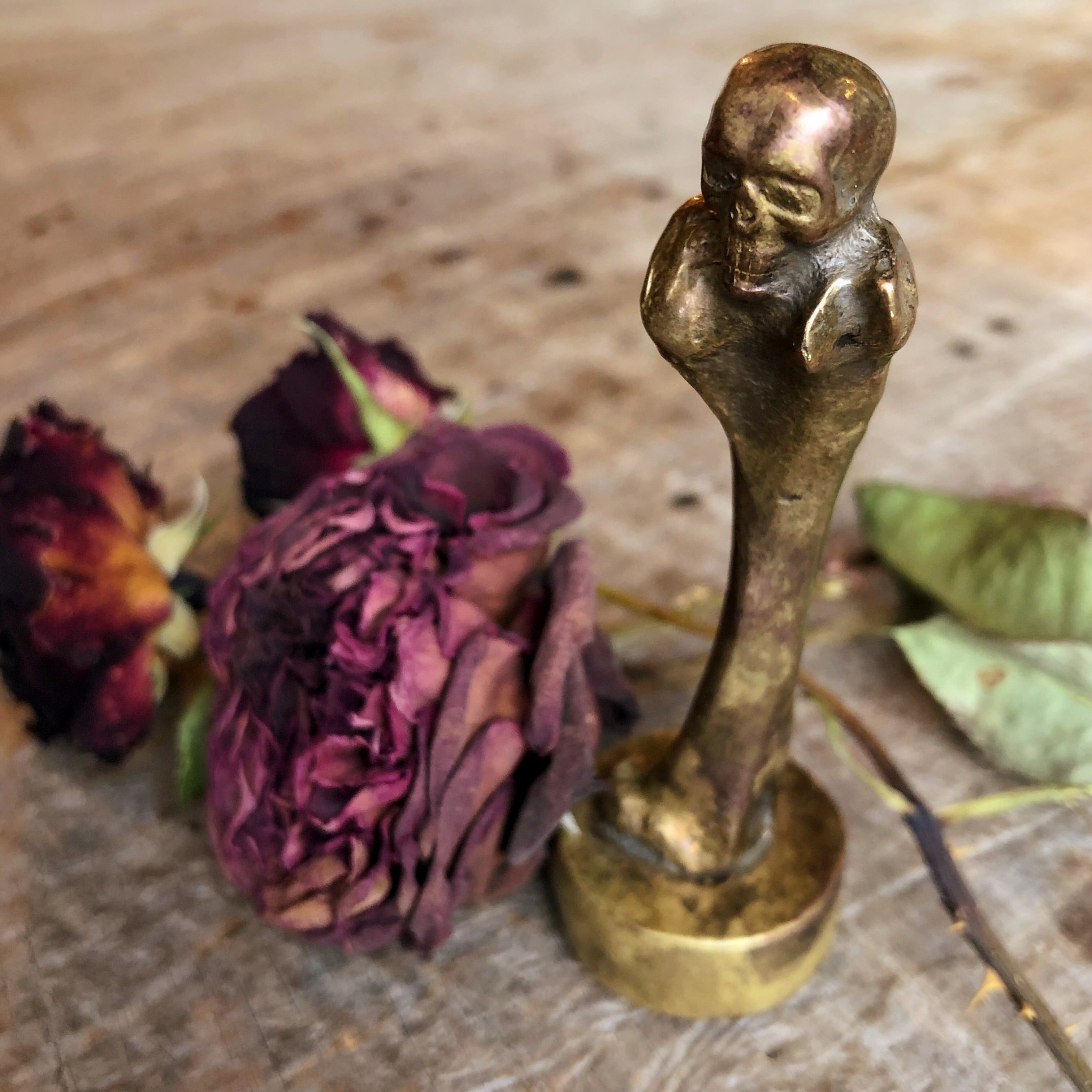 フリーメイソンの印章はいかがでしょう。骨の上に髑髏が乗ったデザインで、印章はコンパスと定規。深くくっきりした印が取れます。印章としては大型で、机の上に置いておくだけで存在感あります。年代不詳ですが100年は経っているように思えます。