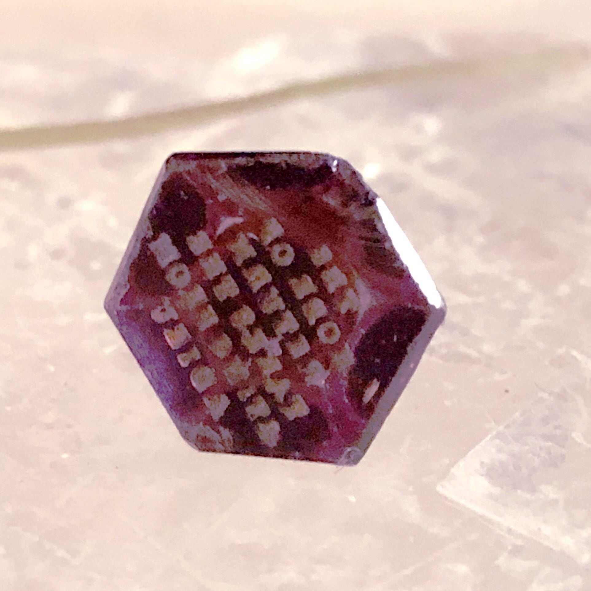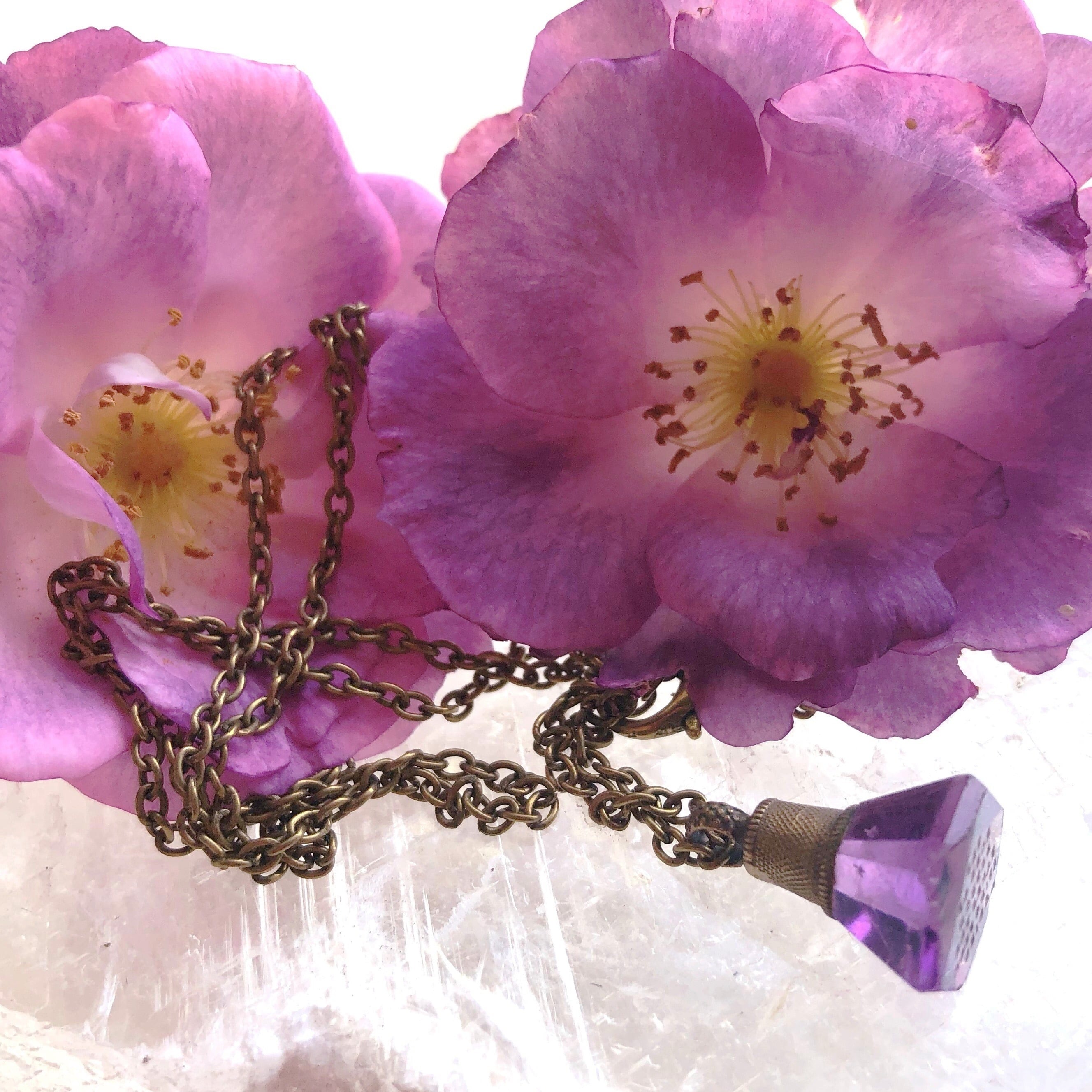 文字が精密に彫られているアメジストは涼やかな透明感があり、対して持ち手の部分の合金は古色がついてよい風合いです。印章面に7ミリ程度の欠けともう1箇所小さな傷がありますが、文字にかかる傷はありません。