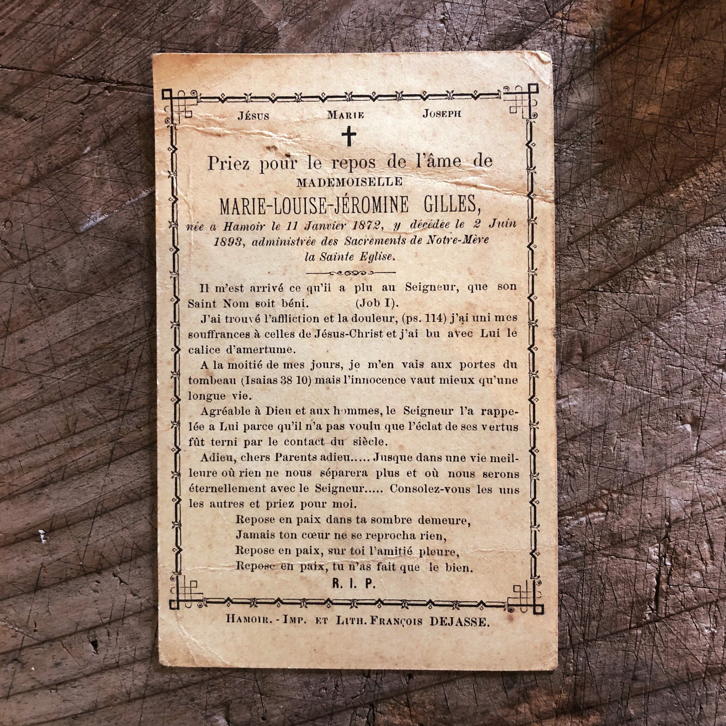 十字架を掲げる天使の姿、足元に「彼女の魂は神の御許へ」と書かれているこのカードは、1893年21歳で亡くなった女性のものです。天使の表情はまだ愛らしさを残しつつも凛として穏やかです。色使いは質素ですが、表現は素晴らしく、残された人々が亡くなった女性を思う気持ちが伝わってくるようです。