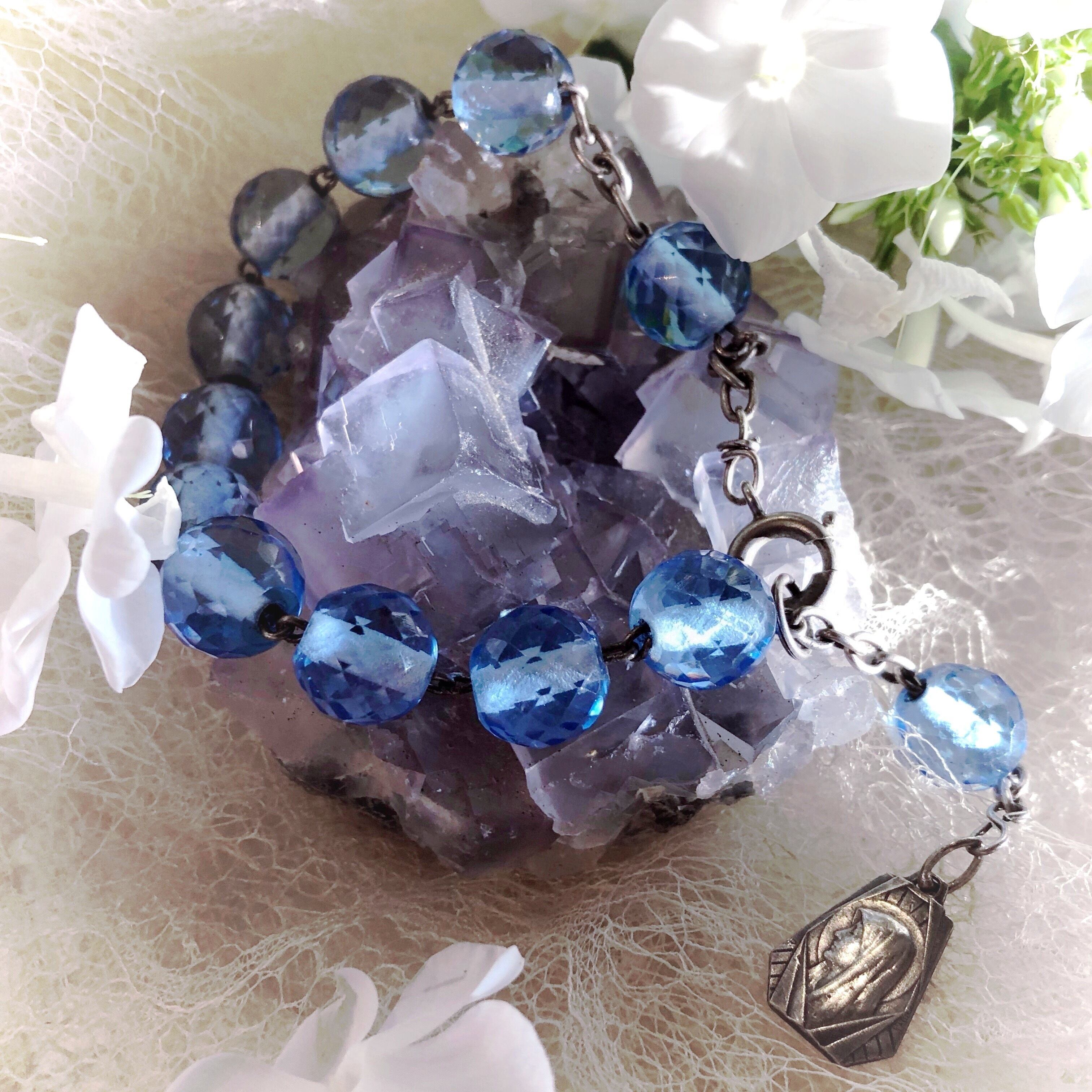 とても清らかで涼やかな青いガラスをあしらったブレスレットです。プレートには女性の横顔、反対の面にはルルドの洞窟でベルナデットが貴婦人と出会う場面があります。